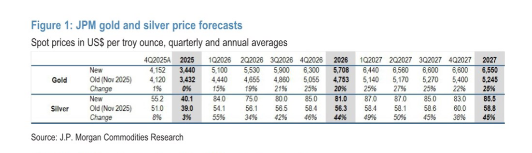 黄金的上涨逻辑坚实有力。研报中《图1:摩根大通黄金与白银价格预测》(第2页)显示,黄金2026年各季度目标价逐步攀升,从一季度5100美元/盎司升至四季度6300美元/盎司,2027年更将突破6600美元/盎司,较此前11月预测上调幅度达25%。