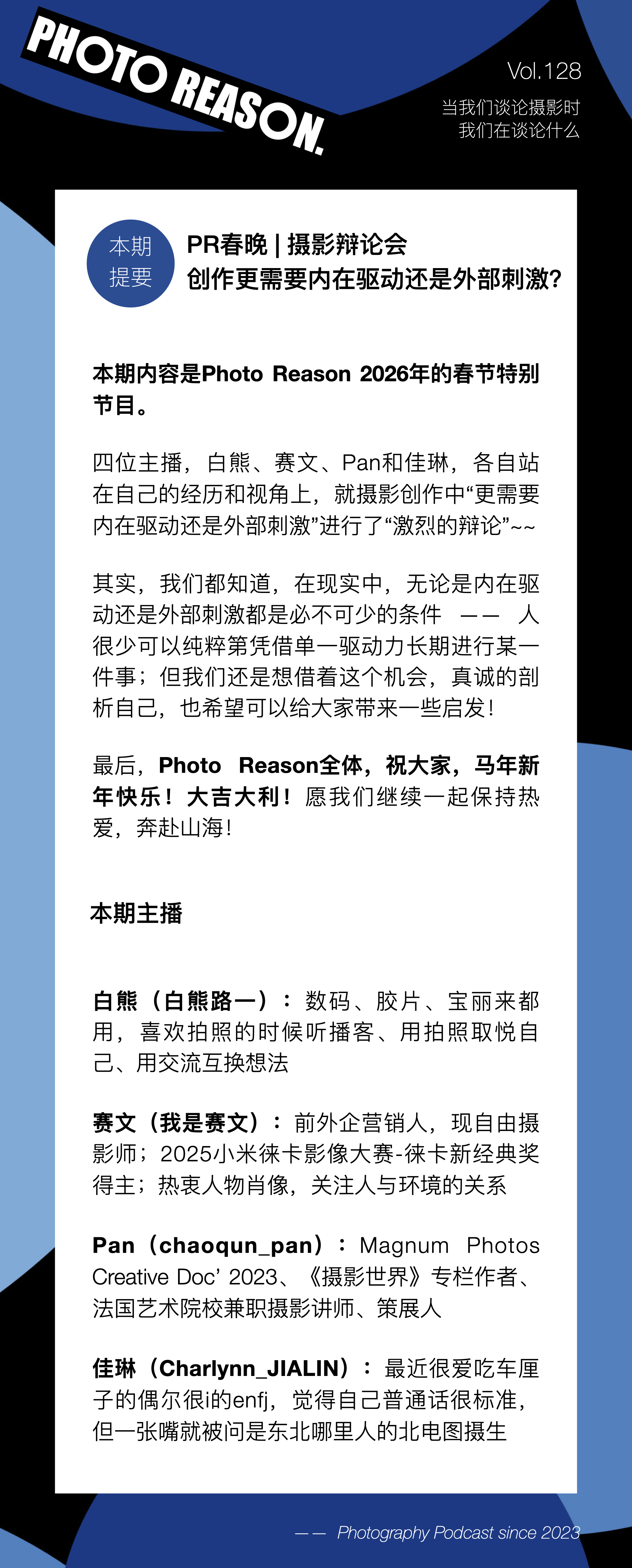 再次祝大家新年快乐!一切美好,正在拉开序幕!Photo Reason 品牌资讯 「Puzzle Plan 拼图计划」2.0 招募中 Mentorship类课程,「领航计划 Radar Plan」上线! 伊斯坦布尔目的地工作坊: 线下空间:「PR / in Space.」线下空间地址及营业时间公告 在售商品:线上购买 特别活动及更多资讯:请关注「Photo Reason」同名公众号及小红书,获取详情。@Photo Reason 2026@本期节目剪辑:白熊 / 小可