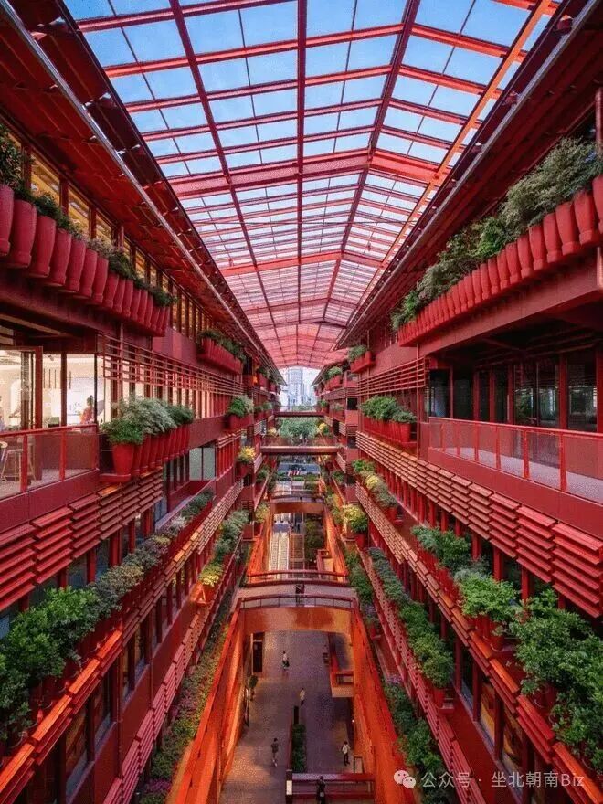 一千个红罐子街区,上海恒基旭辉天地,让·努维尔建筑师事务所设计。建筑在完美嵌入局部都市肌理的同时,以米黄色的外立面限定出了马当路和淡水路的两个入口。市民可以借此窥见内部的独特光线和色彩,以及茂密葱郁的植被。两层的商业店铺由数座小桥和道路相连,并被两堵特制的花墙所围绕。花墙上是种有不同植物的红罐,营造了一个色彩丰富的环境。