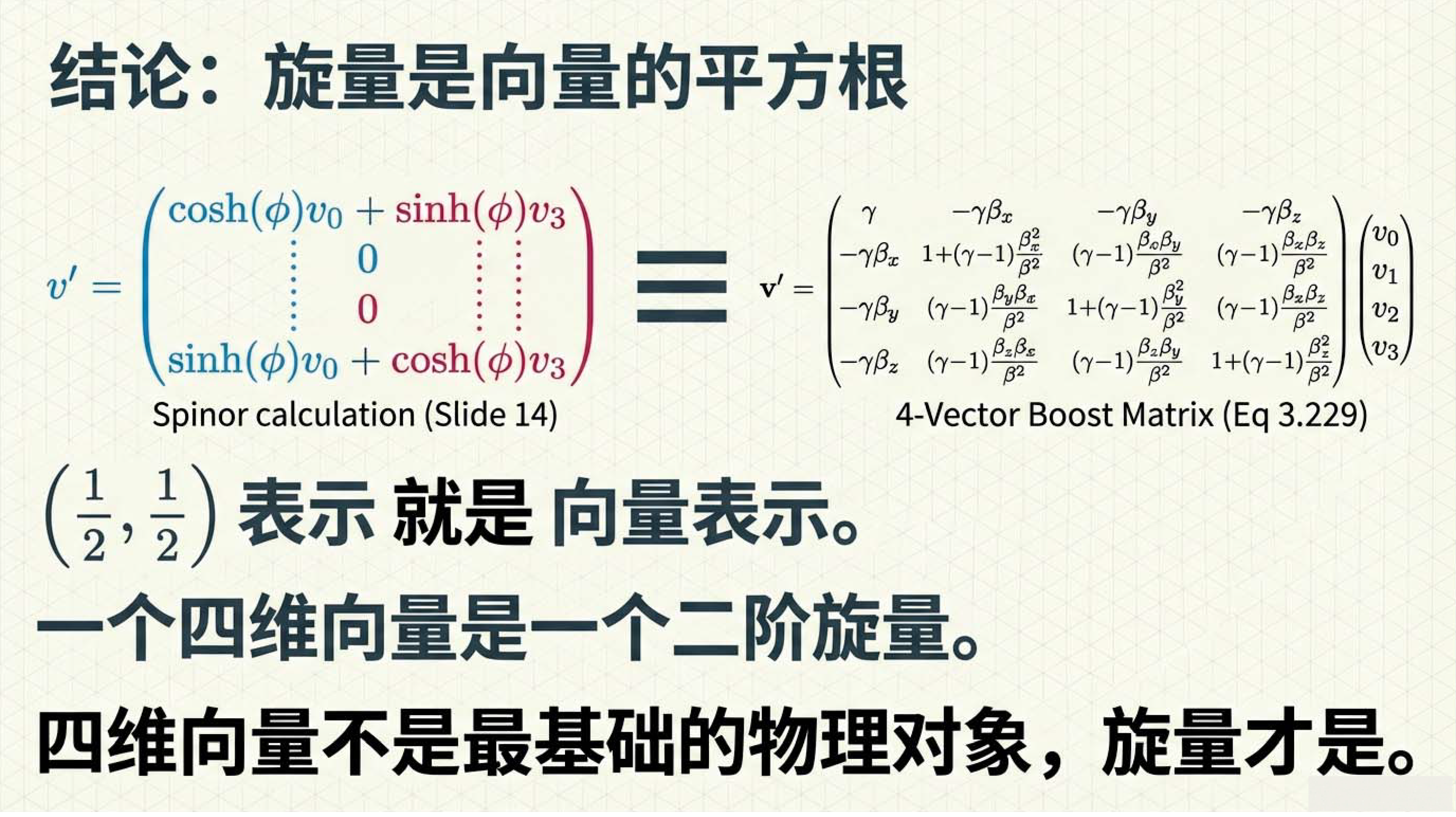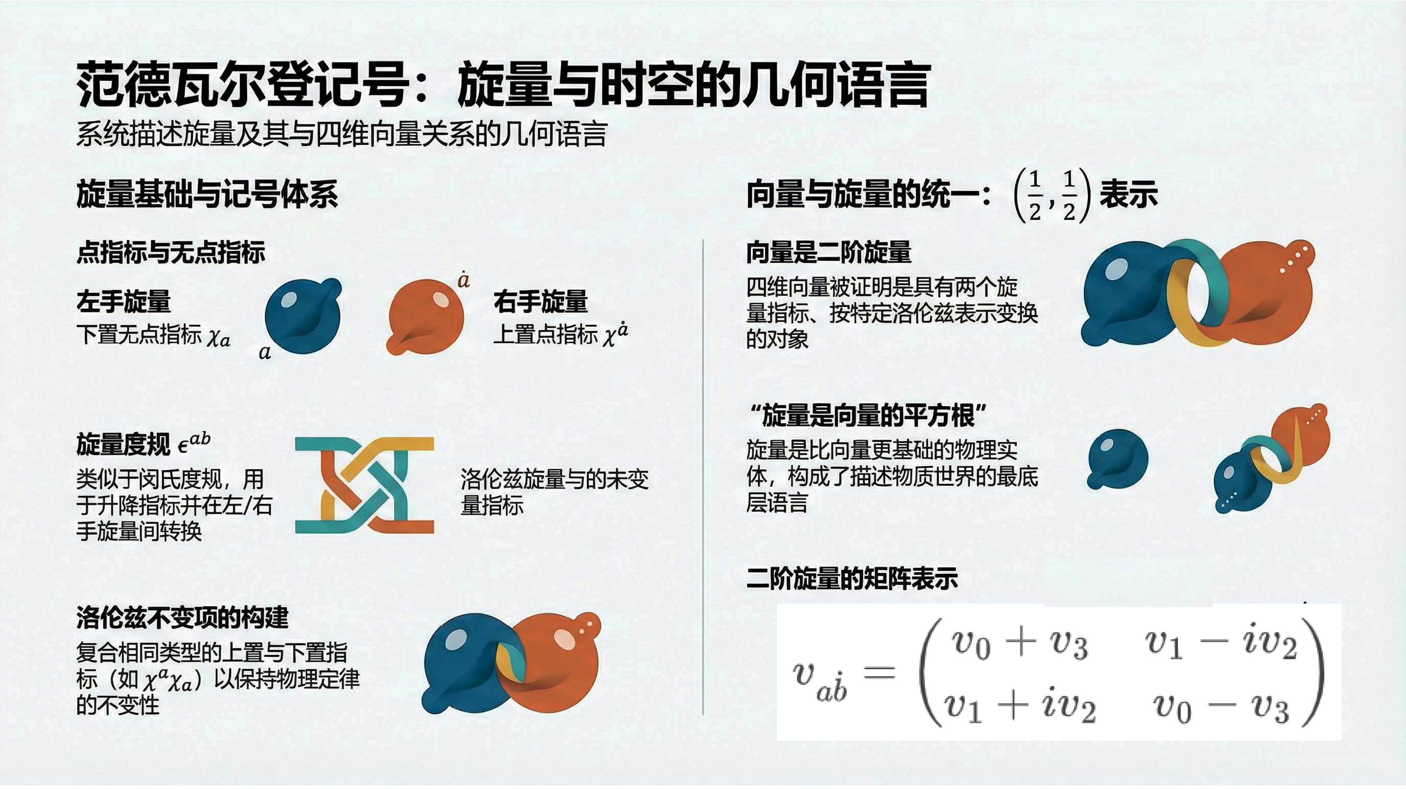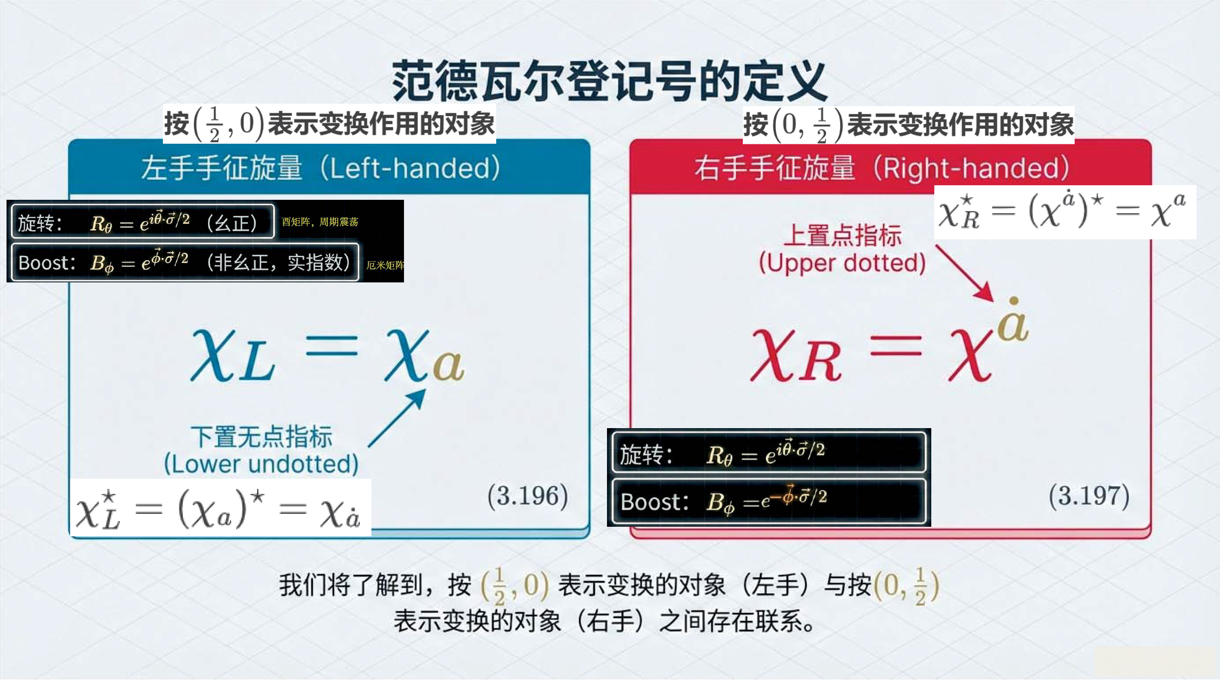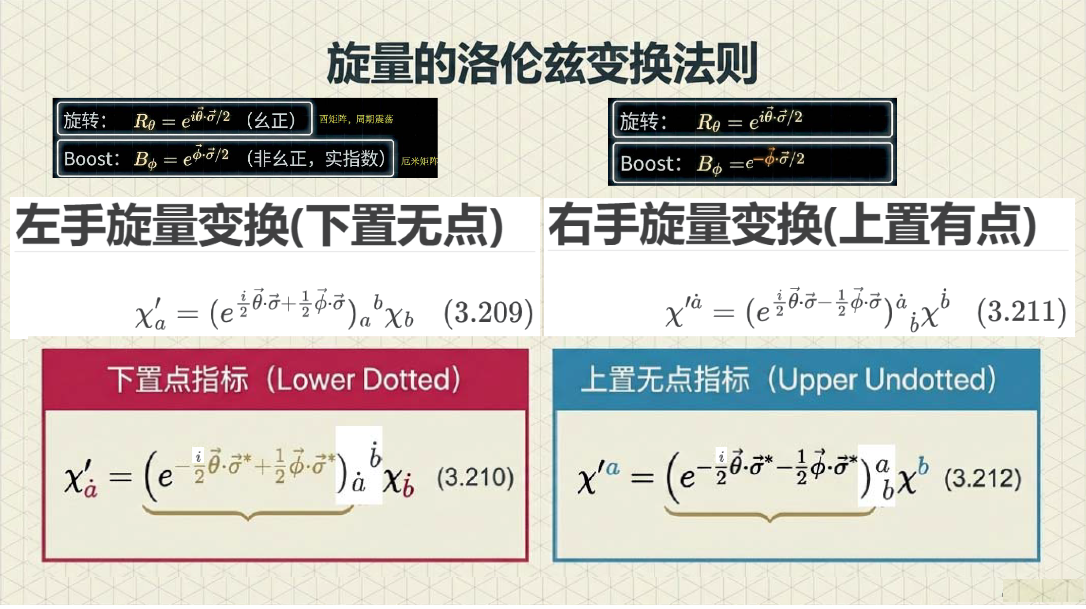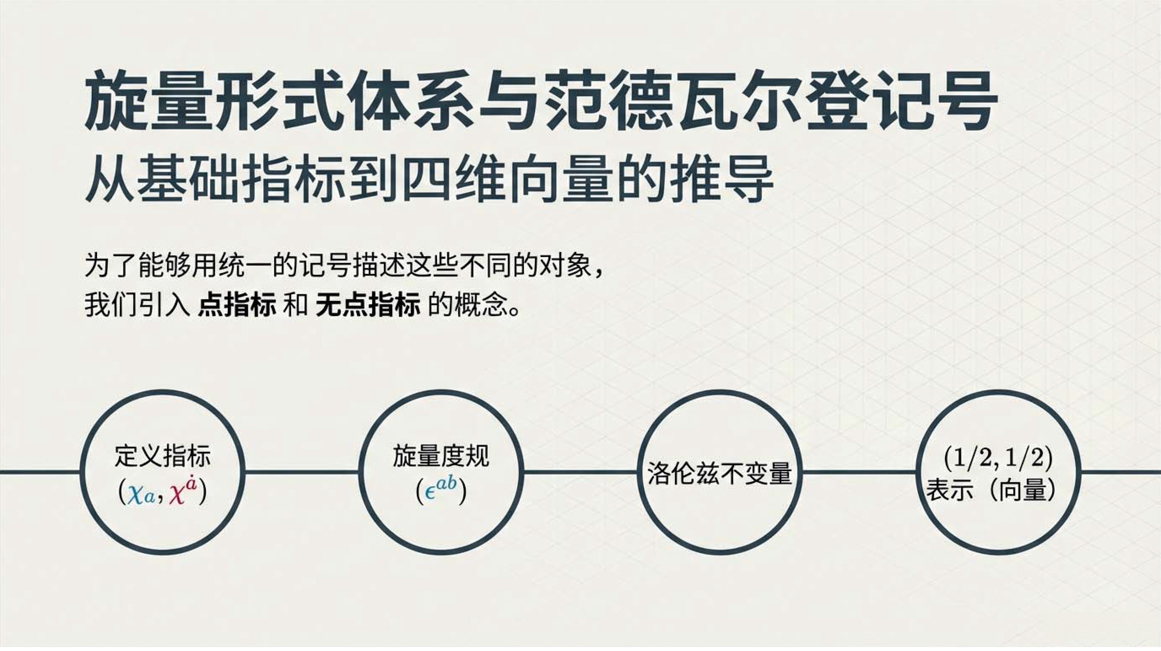 本课引入范德瓦尔登记号,利用点与无点指标区分旋量手性,并定义旋量度规以实现指标升降与构建洛伦兹不变项。重点证明了 (1/2, 1/2) 表示即为四维矢量表示,揭示了矢量实质上是二阶旋量的本质。