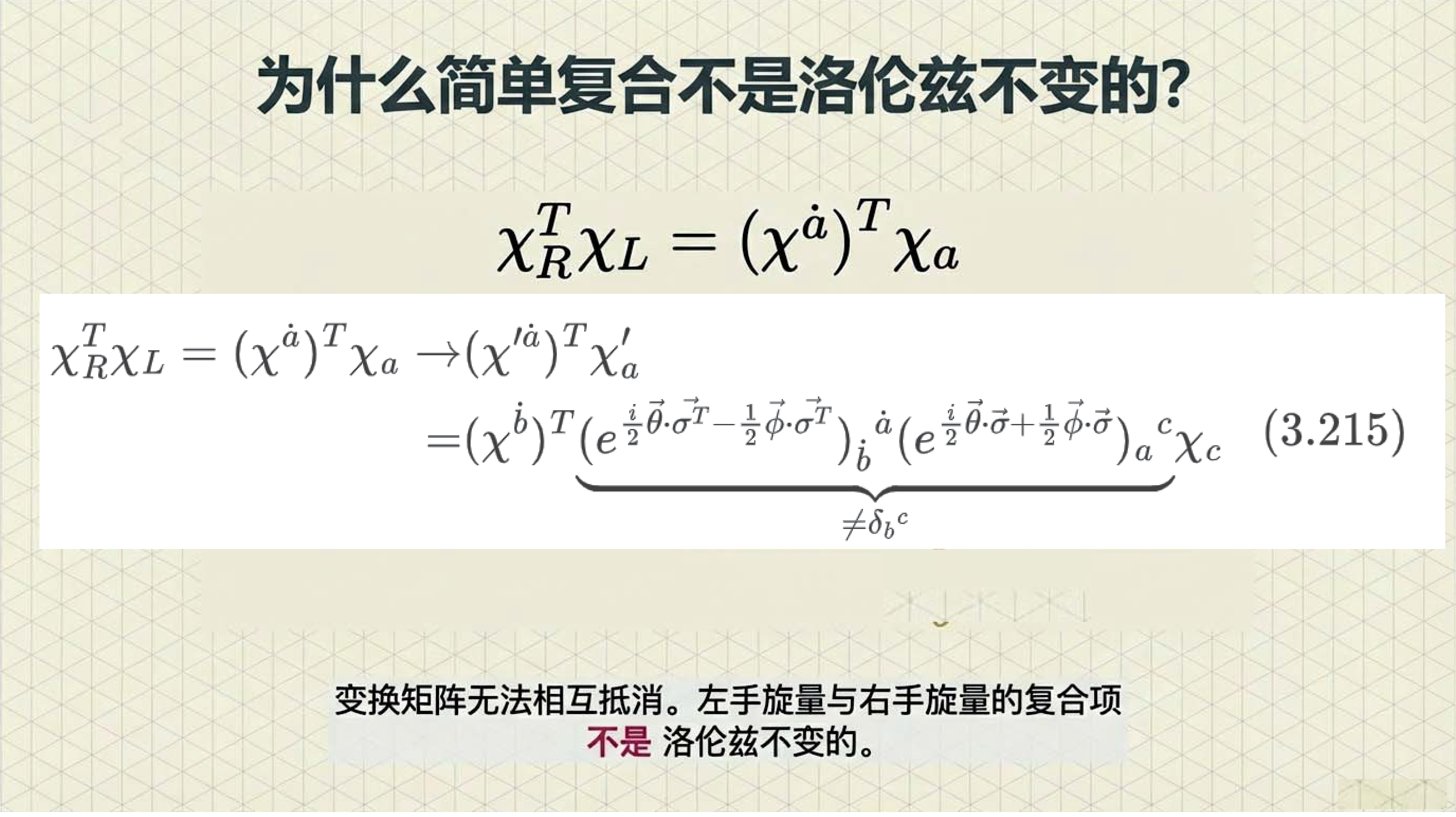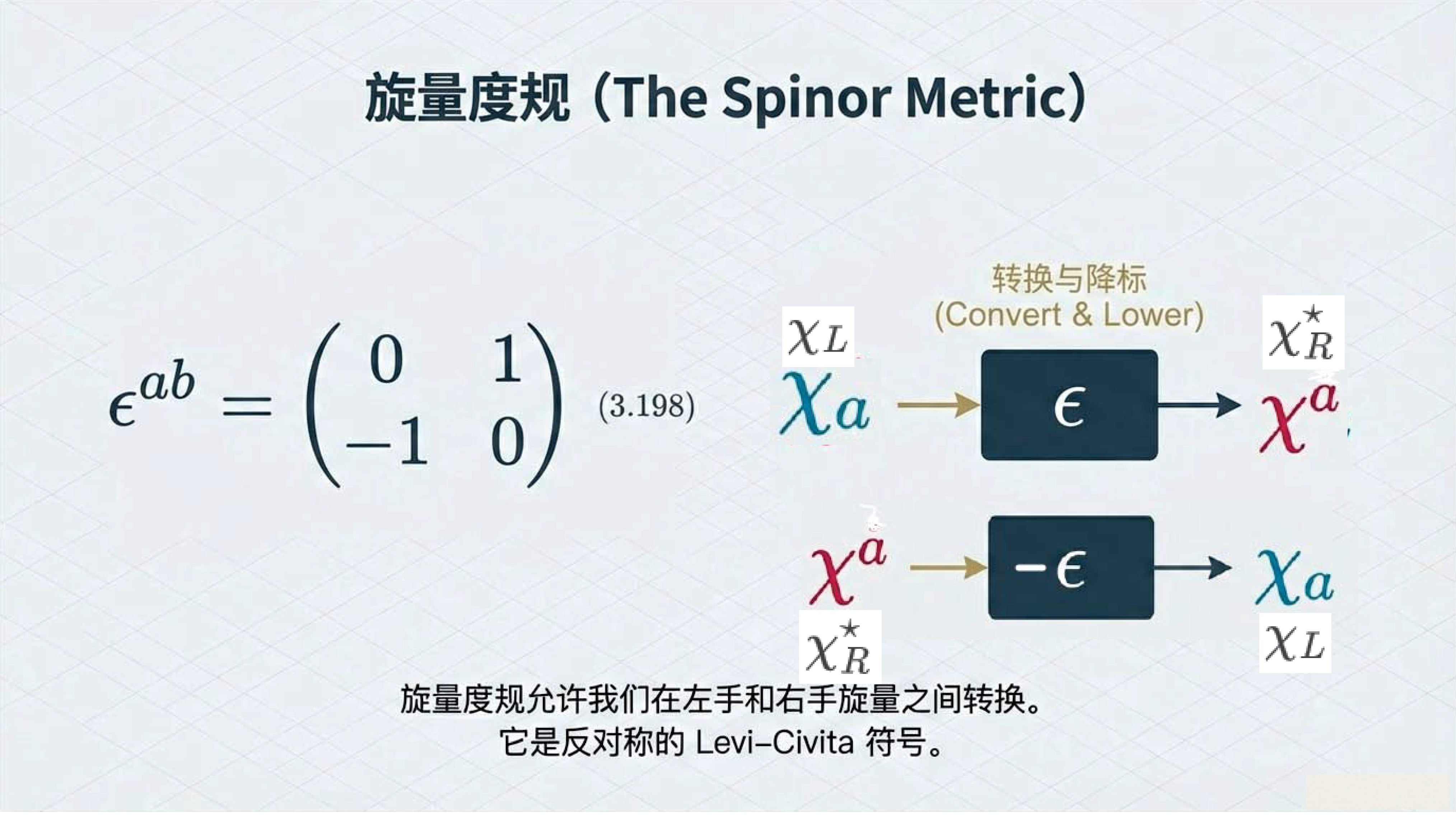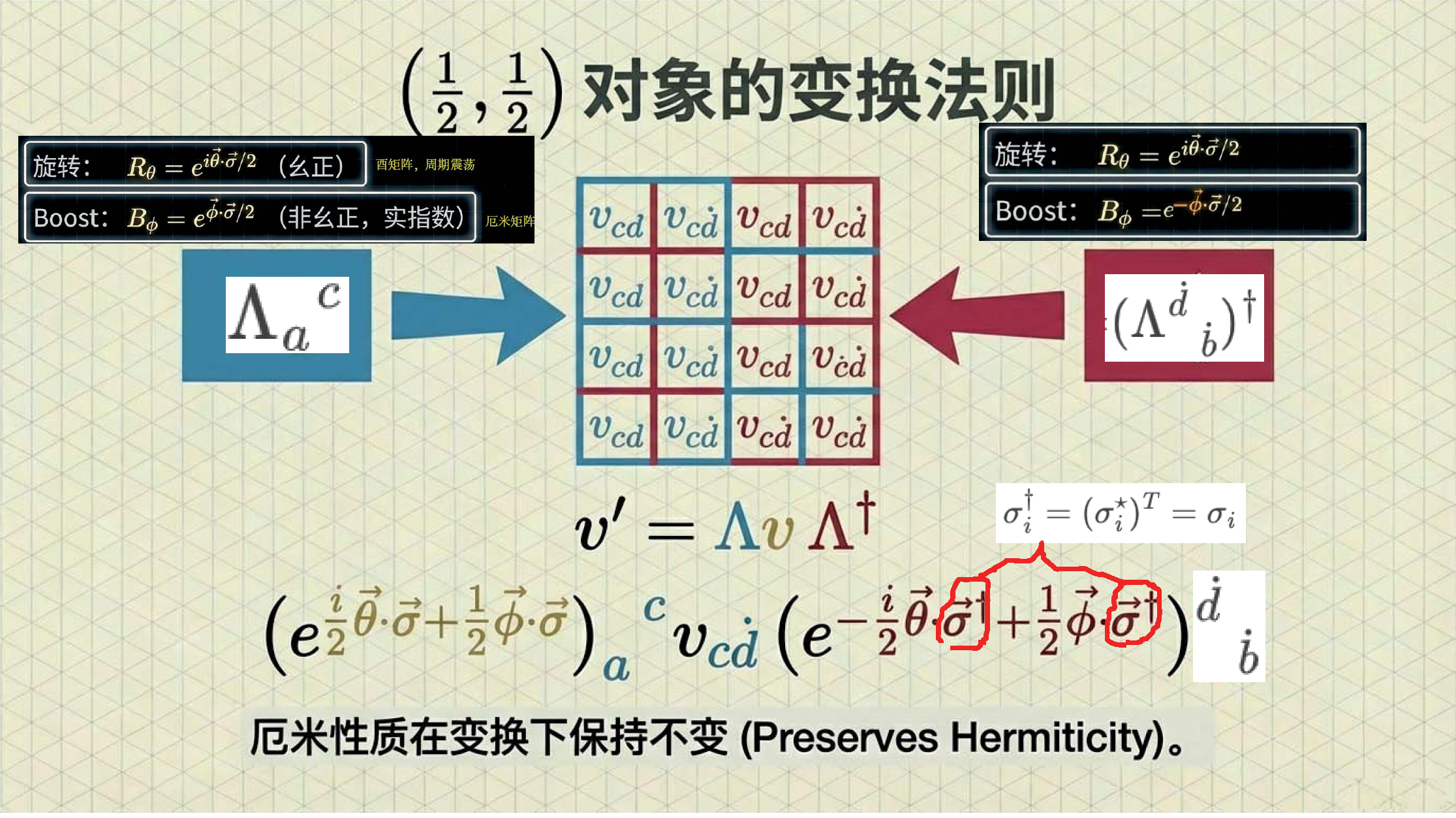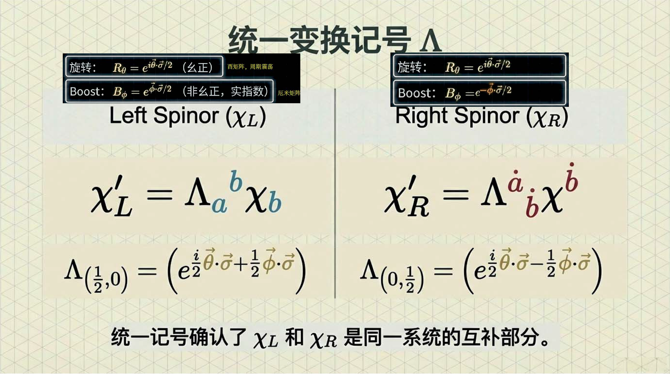 本课引入范德瓦尔登记号,利用点与无点指标区分旋量手性,并定义旋量度规以实现指标升降与构建洛伦兹不变项。重点证明了 (1/2, 1/2) 表示即为四维矢量表示,揭示了矢量实质上是二阶旋量的本质。