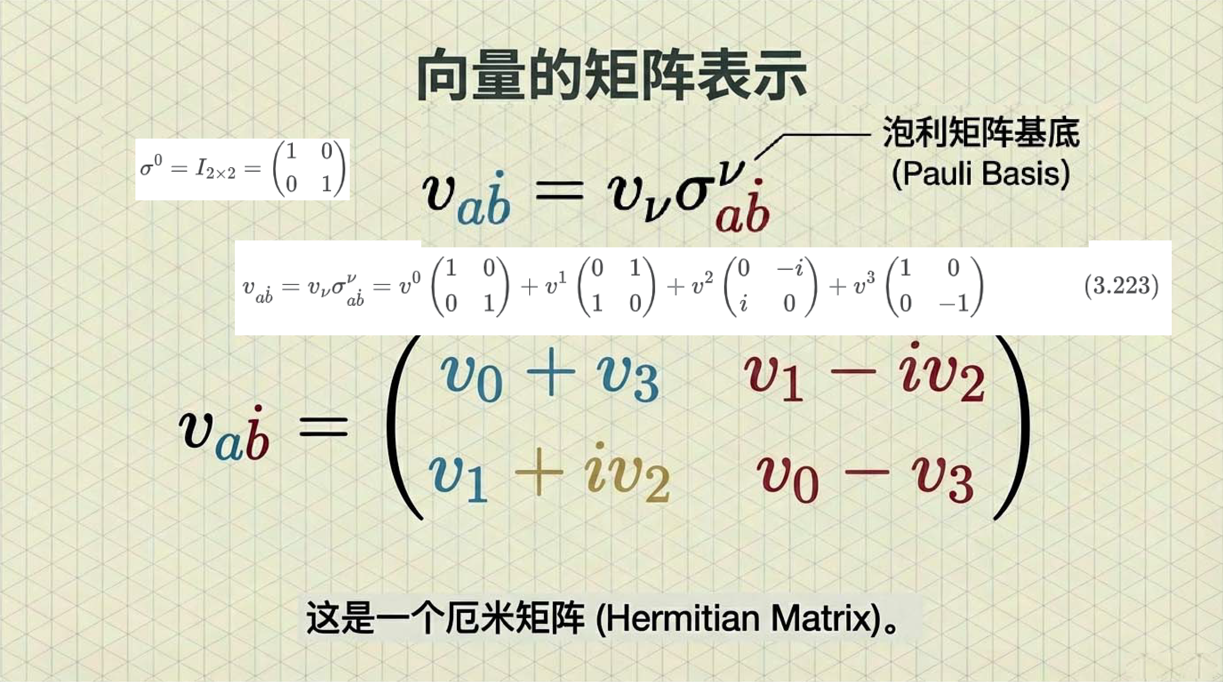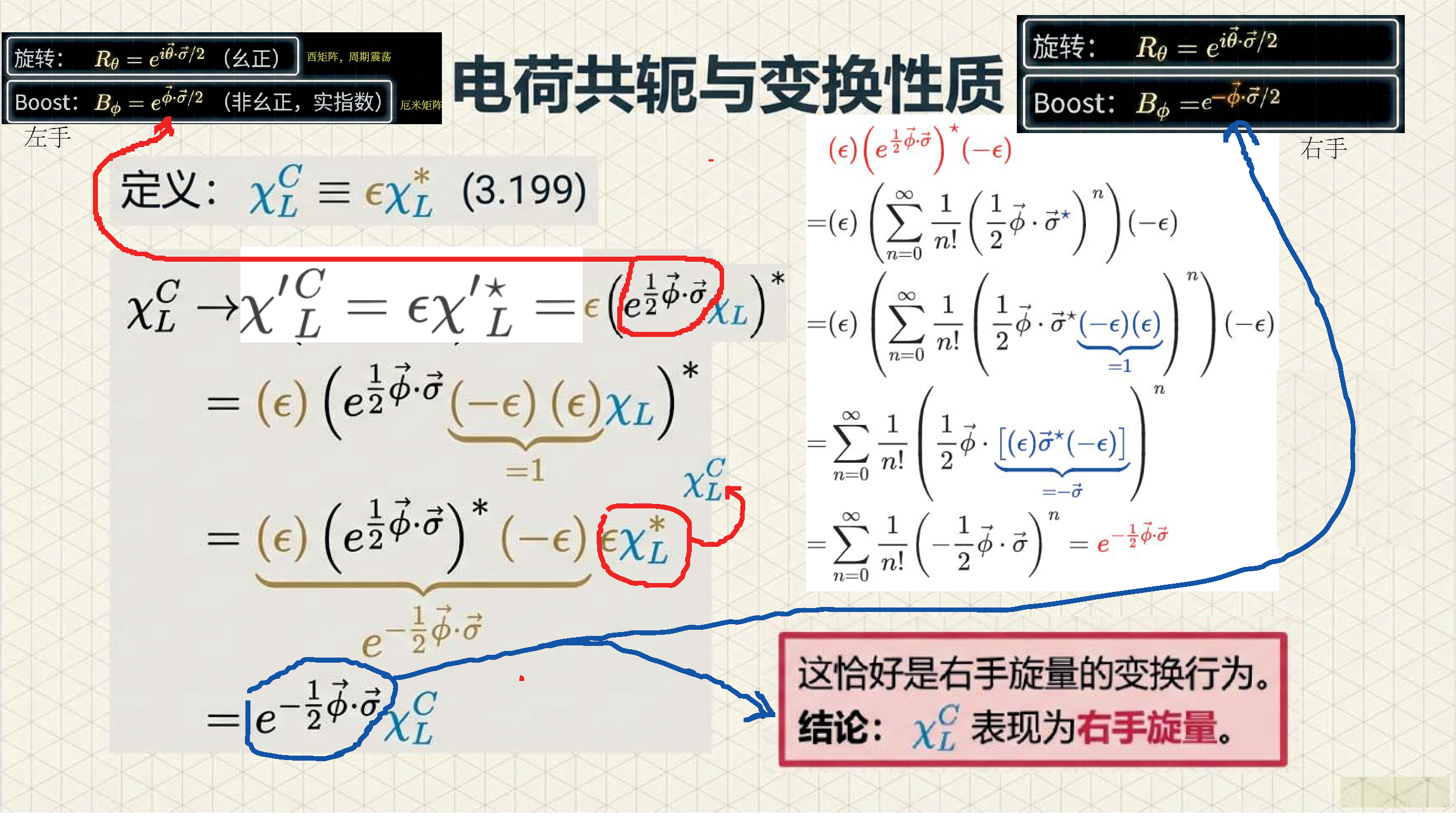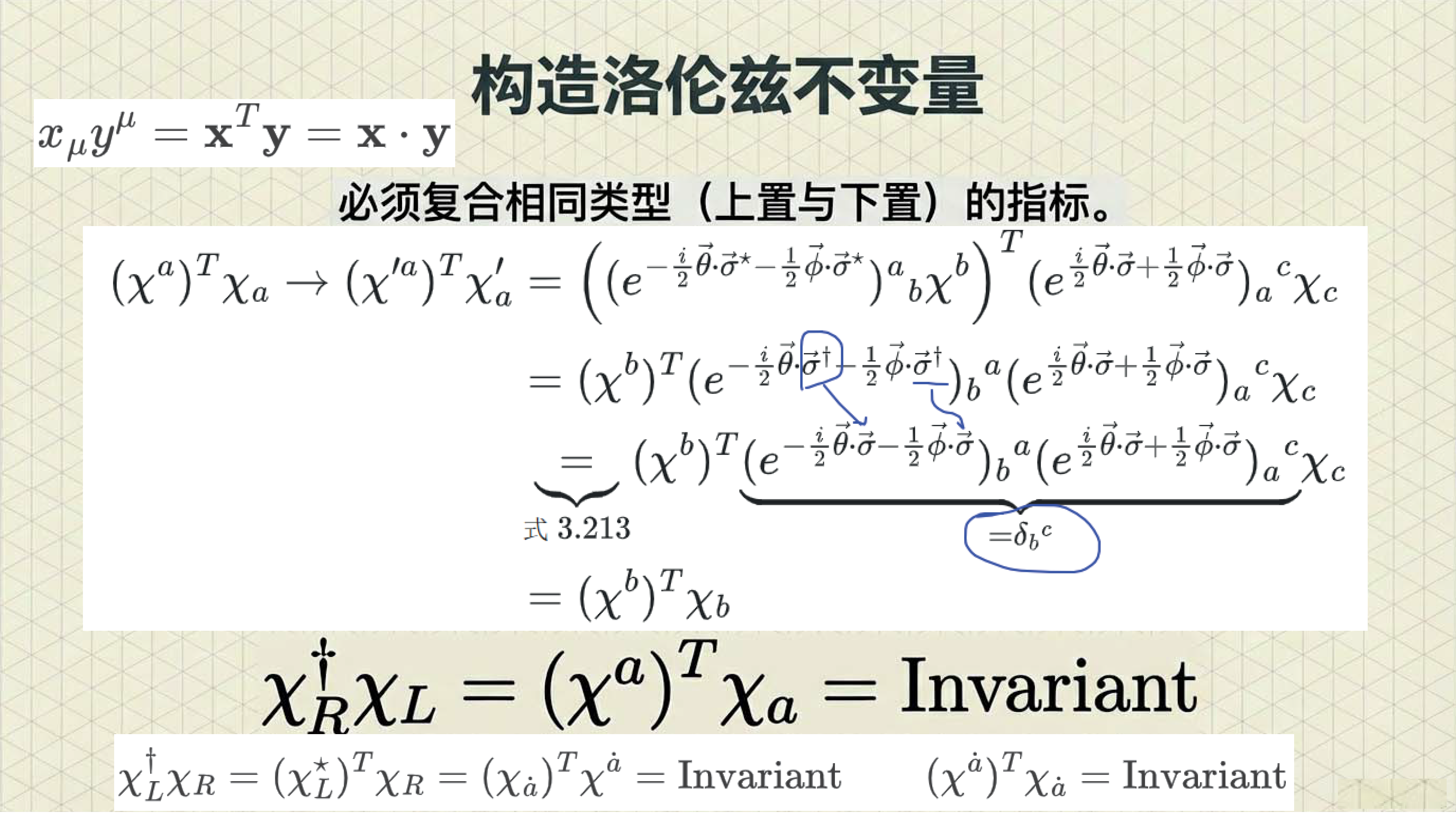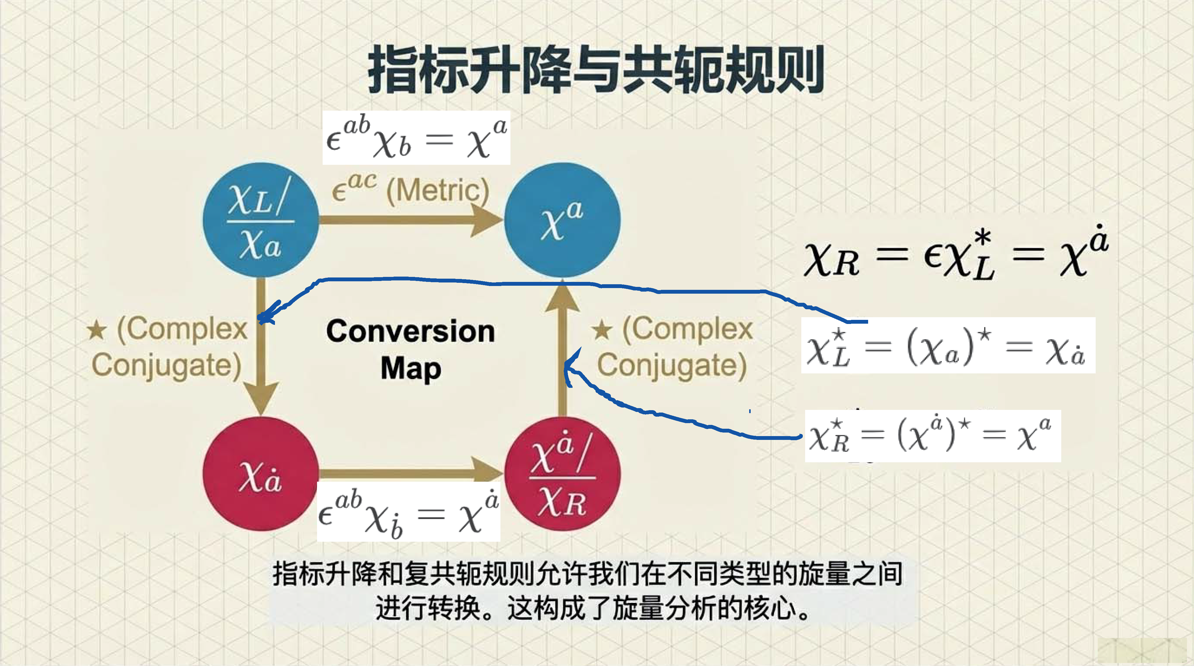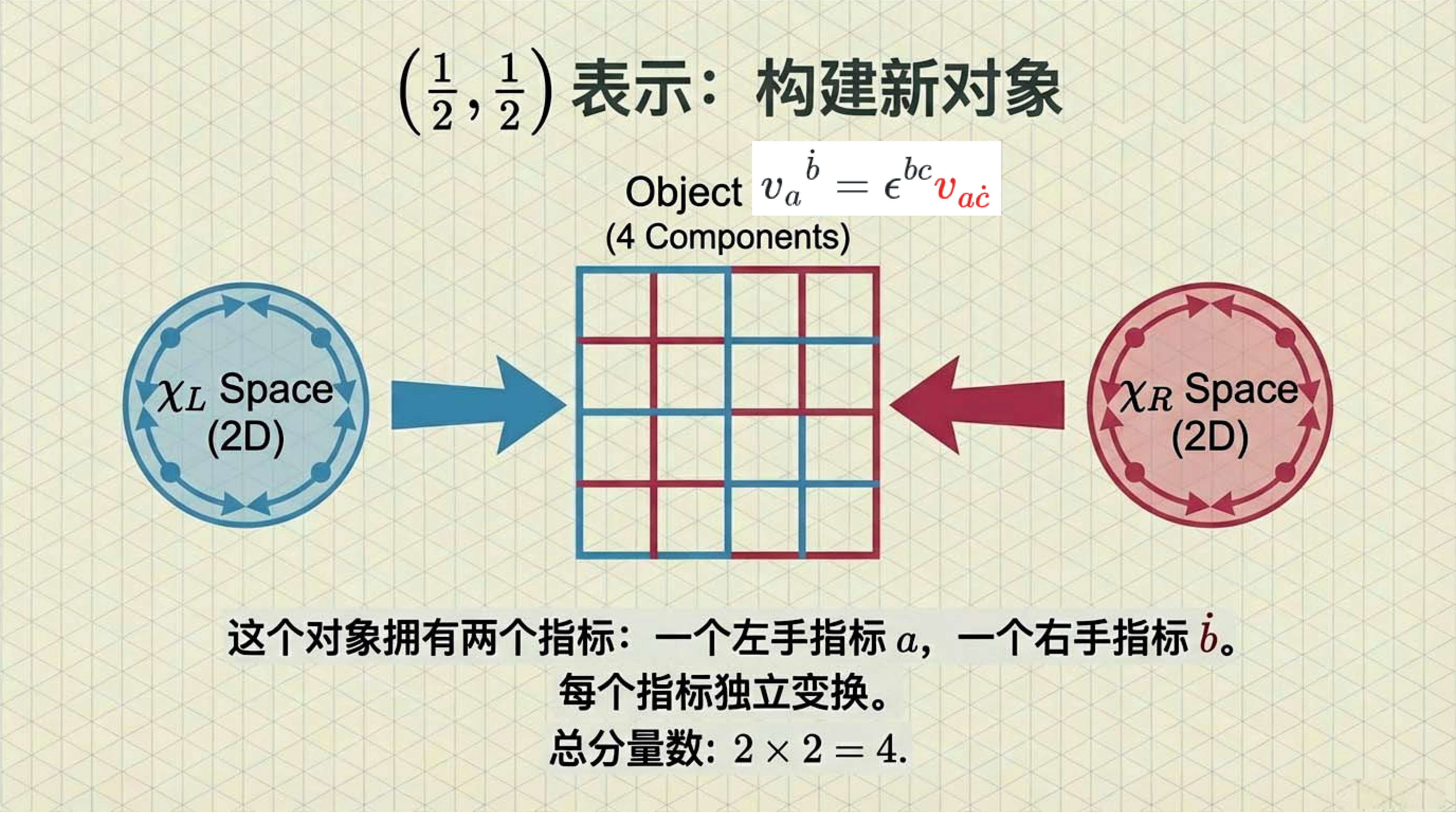 本课引入范德瓦尔登记号,利用点与无点指标区分旋量手性,并定义旋量度规以实现指标升降与构建洛伦兹不变项。重点证明了 (1/2, 1/2) 表示即为四维矢量表示,揭示了矢量实质上是二阶旋量的本质。