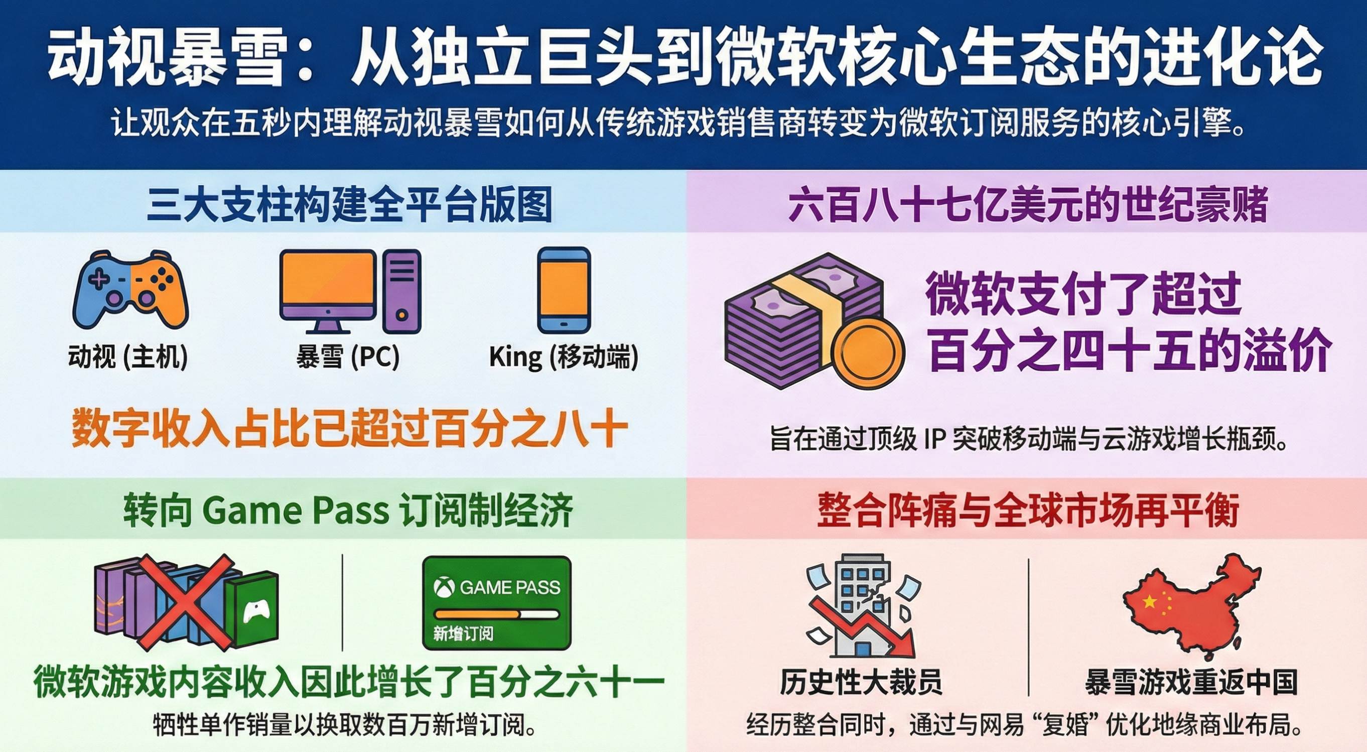 - 地位改变: 动视暴雪不再对华尔街负责,而是为微软的Game Pass订阅数服务。
