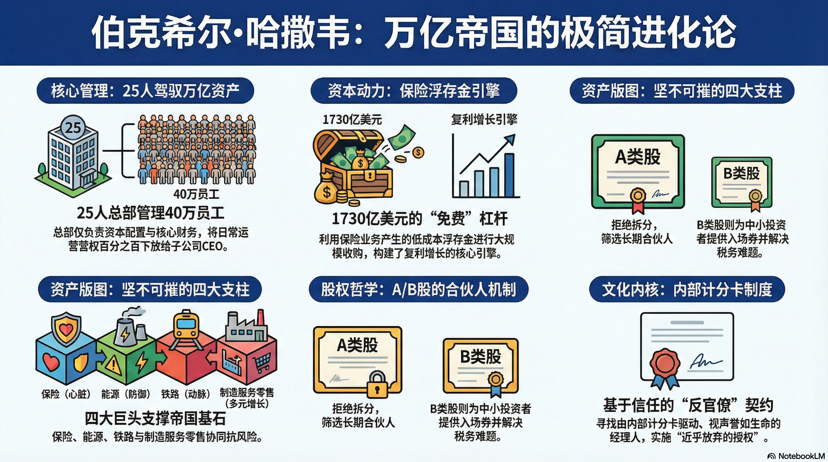 - 详解B类股的两次关键历史:1996年通过发行B股摧毁中介套利空间;2010年拆分B股以配合对BNSF铁路的跨时代收购。