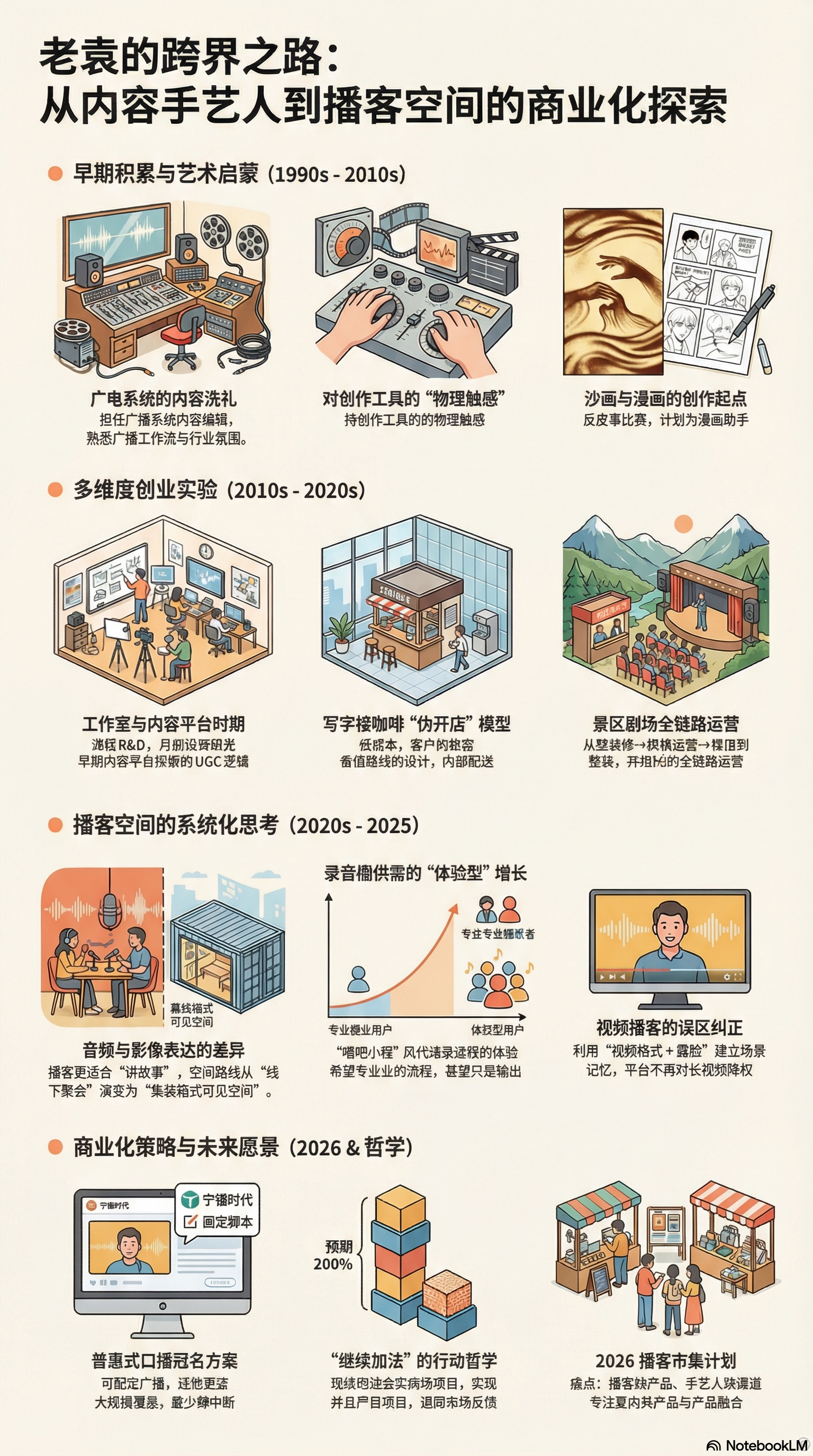 本期我们从“天津广电实习的站内编辑”到“沙画工作室创业者”,再到把播客做成“能被看见、摸得着、找得到”的线下空间与生态——本期老袁把自己的多段人生链路串成了一条清晰的“创作—经营—社群—平台”路径,并抛出2026年的关键关键词:线下、普惠、PR预算、POPUP录音解决方案、视频播客的正确打开方式、播客市集(产品化)。
