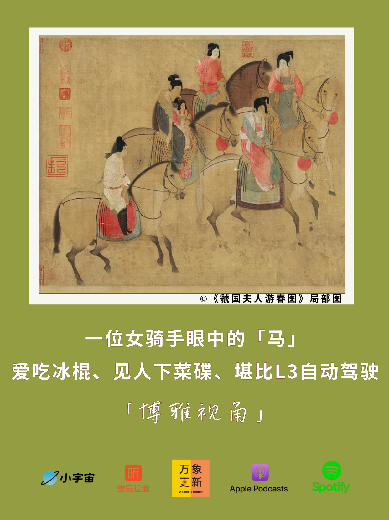 本期节目是万象更新为丙午马年特别制作的新春特辑,我们邀请到的嘉宾是爱好骑马的果果,她分享的骑马体验和心得让南西和宁忆大开眼界:比如马是如何“见人下菜碟”的,骑马完全不靠体力而是靠心理素质,还有骑马时感受到的恐惧和自由。除此之外,我们还会聊到从生理构造上来说,骑马是否男女有别,野马群的故事,人类驯化马的历史,还有唐代艺术作品中女性骑马自在出游的生命力,以及西方女性骑马姿势和服装的变化等等。希望这期节目能让你从一个不同的角度打开马年。