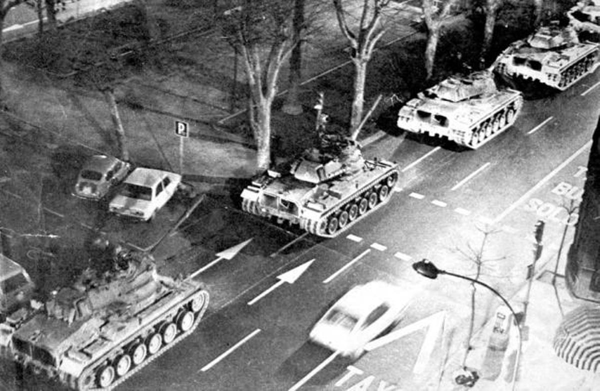 支持硬政变方案的米兰斯将军在瓦伦西亚宣布该地区进入紧急状态,50多辆坦克开上街头,占领了主要的行政大楼和电台。