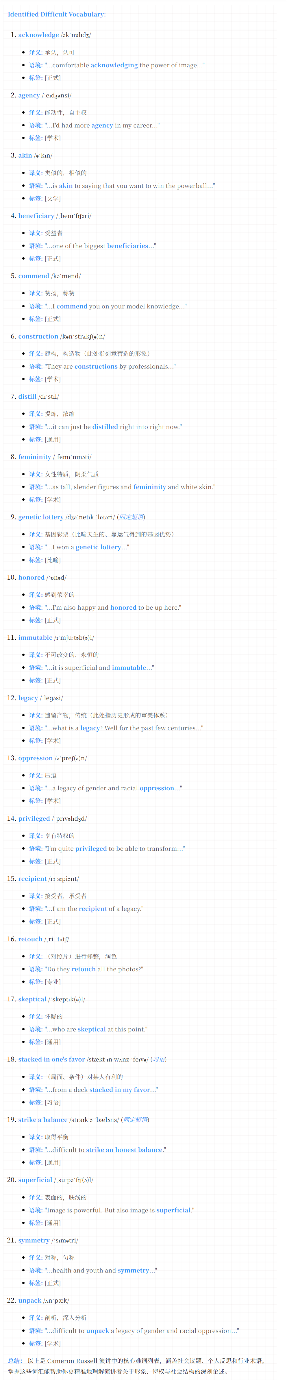 演讲时长约9分钟,Russell通过个人经历剖析了时尚行业的表象与现实。她承认自己赢得了“遗传彩票”——高挑、漂亮,成为内衣模特,但强调外貌并非定义一切。她现场换装演示了如何在10秒内从“普通人”变身为“性感模特”,揭示了图像构建的过程,包括修图、造型和姿势如何创造幻觉。Russell讨论了行业中的种族偏见(模特多为白人)和性别问题(如16岁时就被要求摆出高度性感的姿势),并分享了作为模特的特权与不安全感。她鼓励观众质疑媒体对女性的刻画,并呼吁父母教育孩子外貌的局限性。