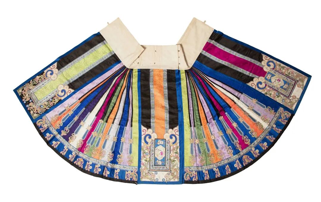 多色缎地绣庭院仕女缀花卉纹月华马面裙,清,长94.5厘米 宽121厘米,广州博物馆藏