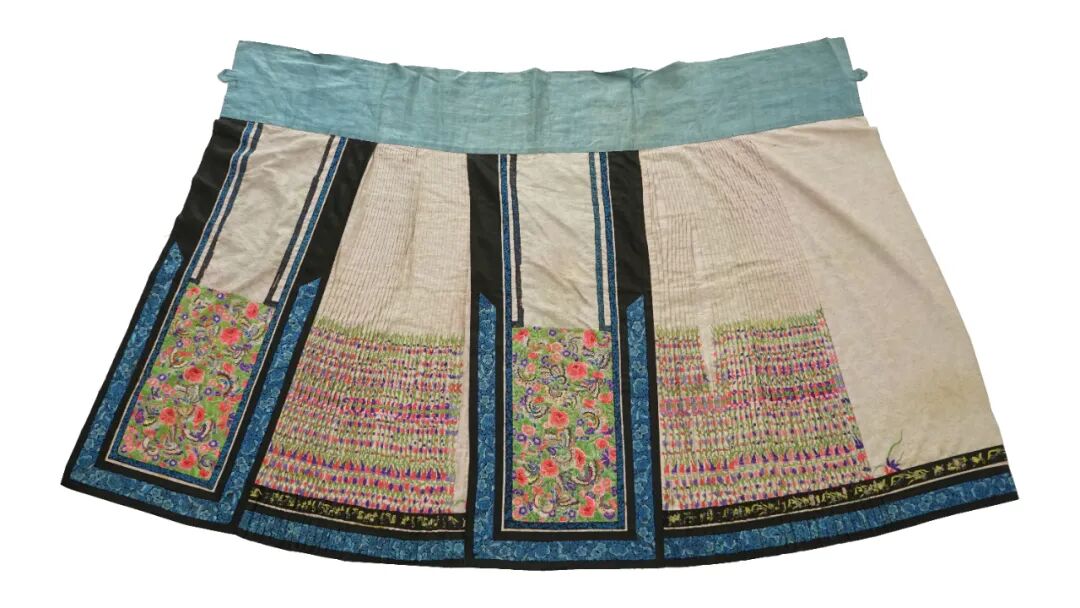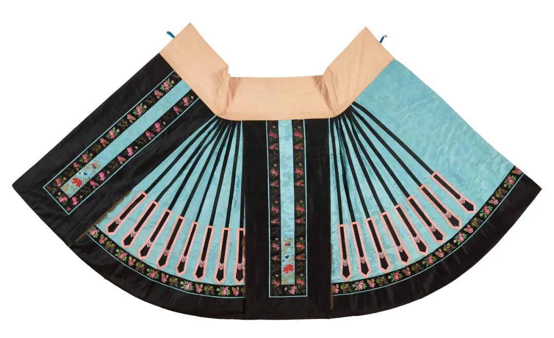 蓝色暗花缎地绣花鸟纹夹棉阑干马面裙,清,长118.2厘米 宽100.8厘米,北京服装学院民族服饰博物馆藏