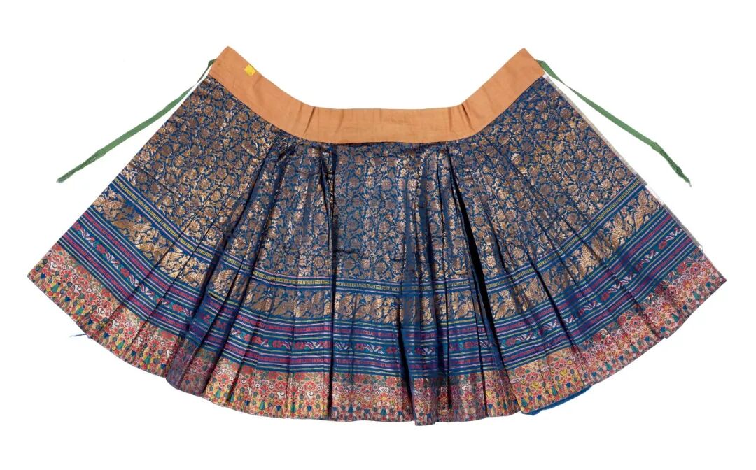 蓝色缠枝四季花卉纹织金妆花缎马面裙,明,长88厘米,腰围104厘米,山东博物馆藏