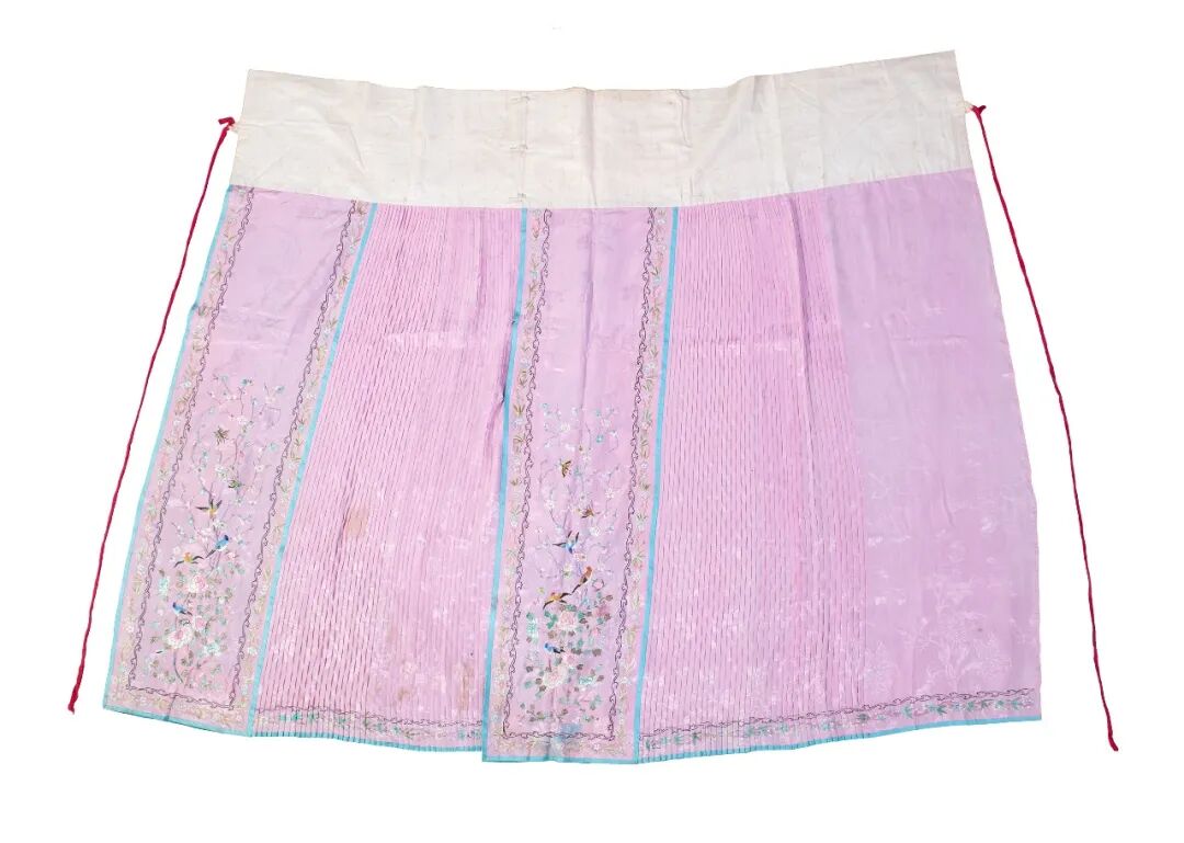 粉红暗花绸绣花鸟纹鱼鳞马面裙,二十世纪初,长104.5厘米 宽172厘米,广州博物馆藏
