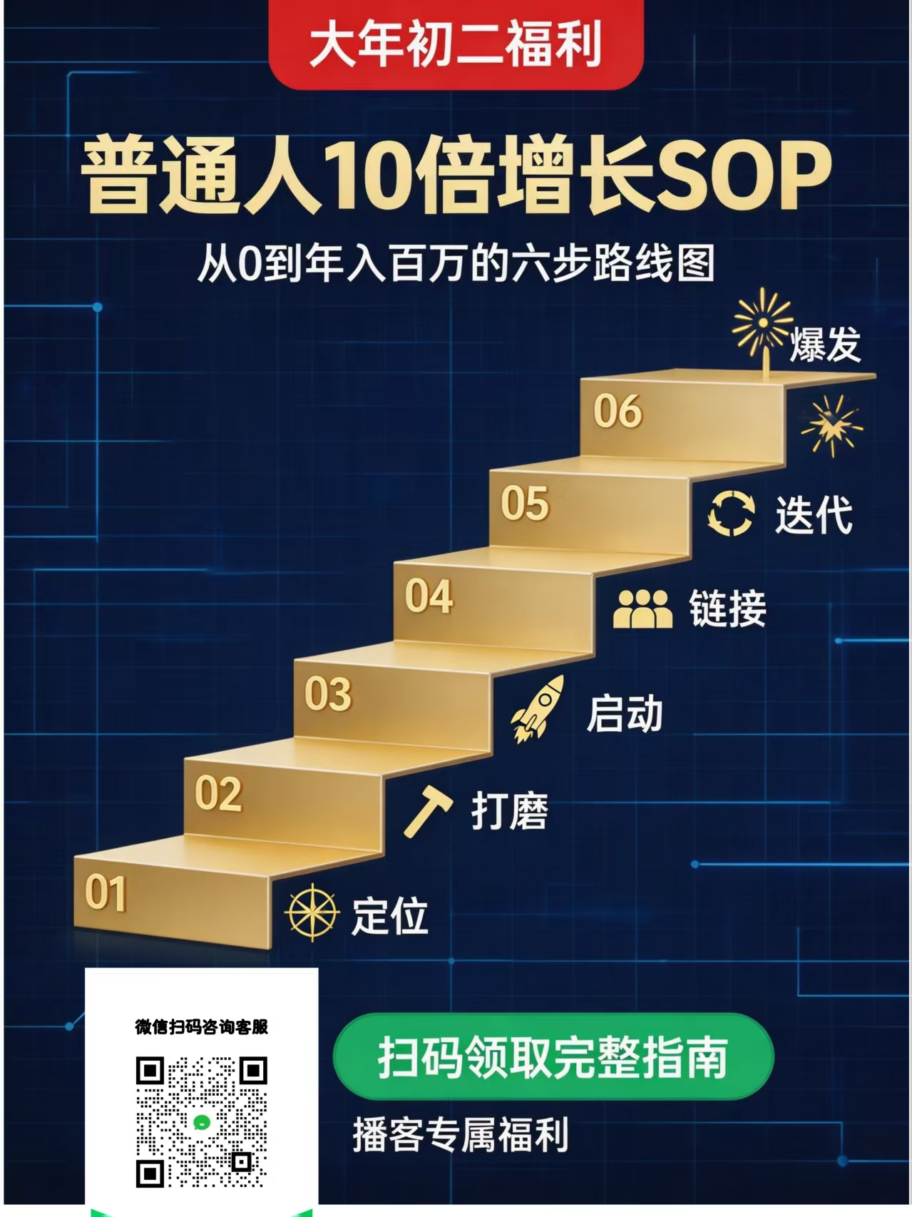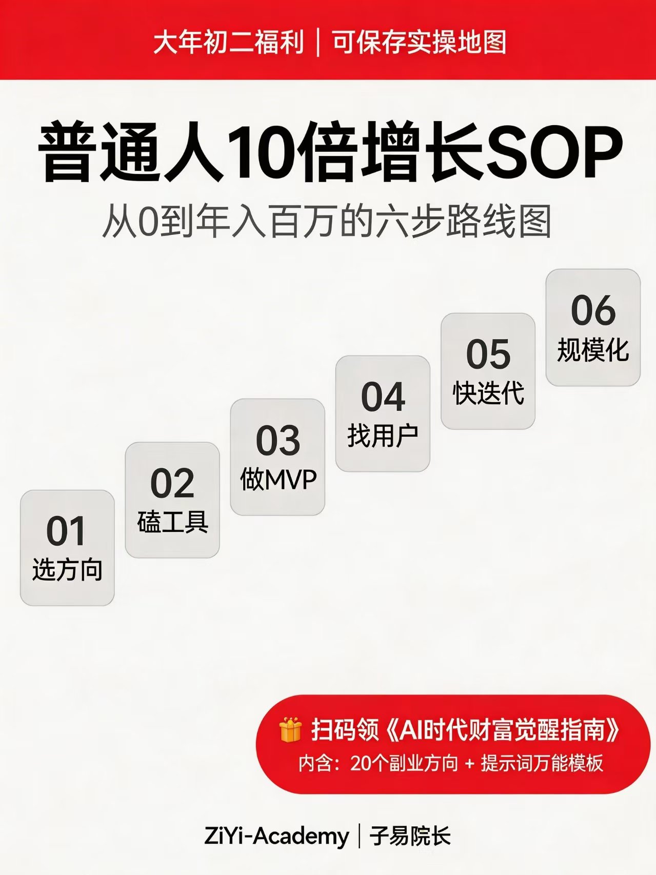 微信搜索添加 ZiYi-Academy,备注暗号 “AI觉醒”,即可领取本期节目配套的《AI时代财富觉醒指南》电子版(含完整SOP清单+20个副业方向+提示词模板库)。