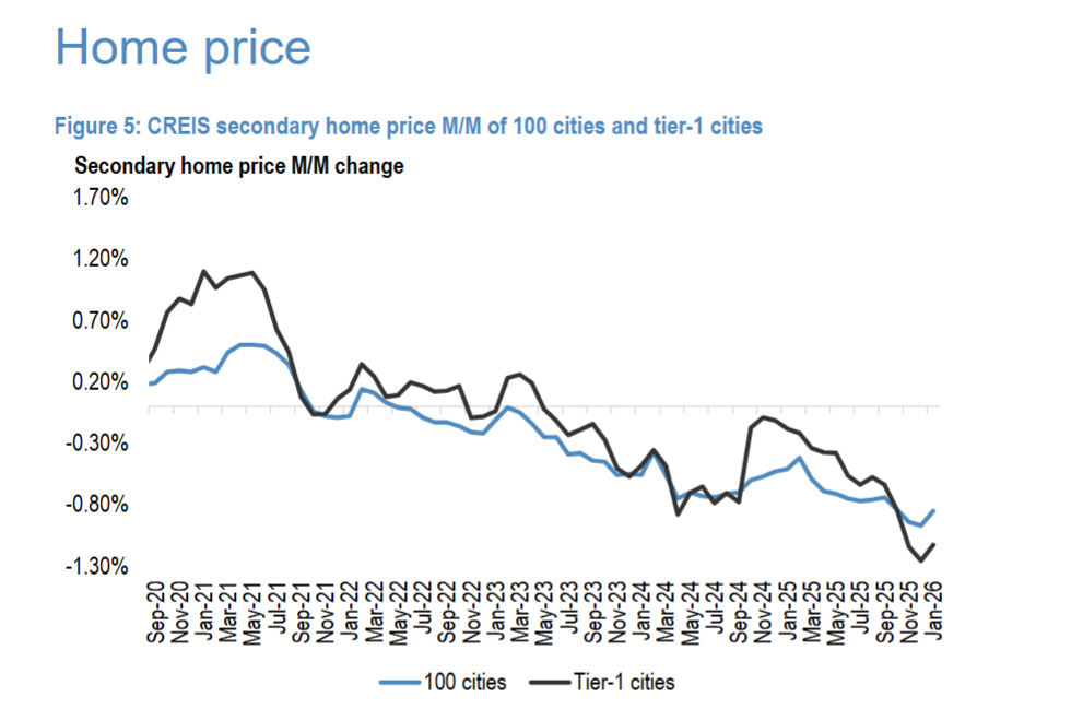 图5(CREIS百城及一线城市二手房环比价格)显示,100城二手房价格环比跌幅从12月的-0.97%收窄至1月的-0.85%,一线城市从-1.26%收窄至-1.13%,但改善幅度温和,且受春节前季节性因素与12月减税、北京政策松绑的短期刺激影响。