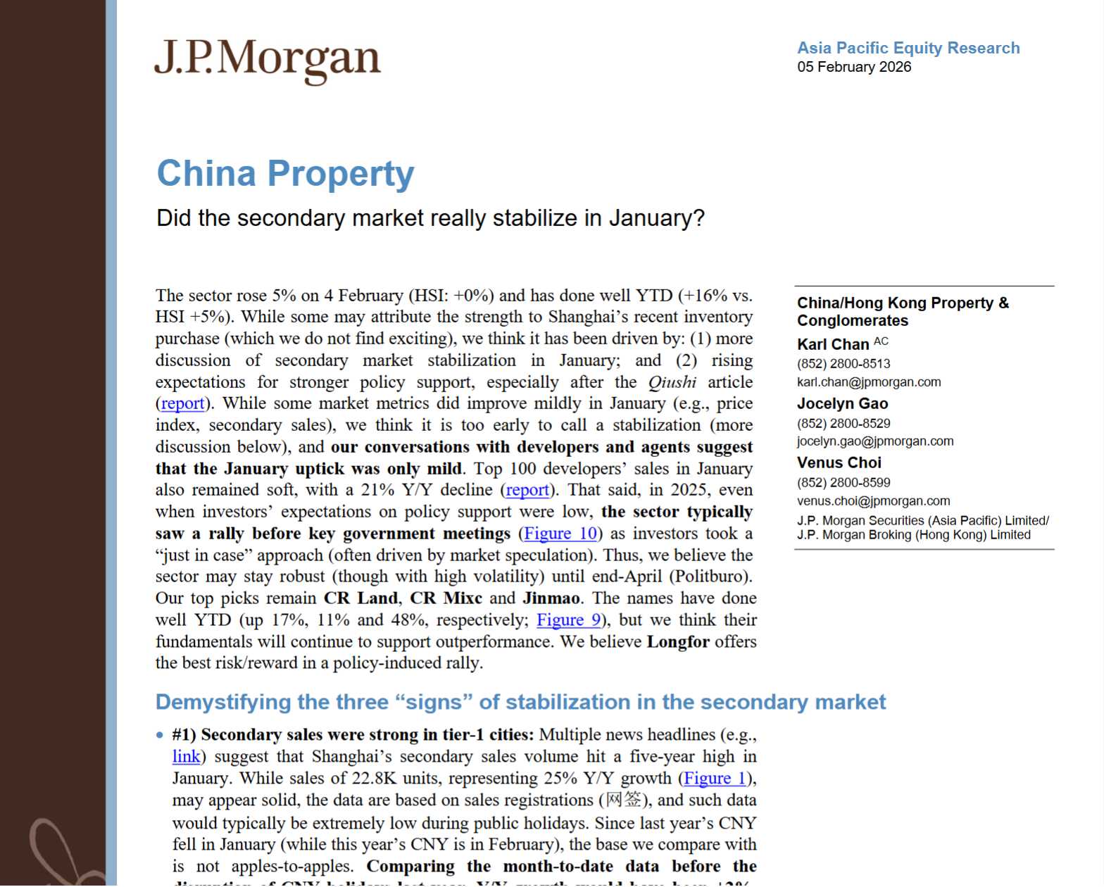 2026年2月5日,摩根大通发布《中国房地产:1月二级市场真的企稳了吗?》研报,明确指出尽管1月部分市场指标小幅改善、地产板块表现亮眼,但断言市场企稳为时尚早,短期行情更多由政策预期与会议前投机情绪驱动。