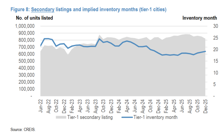 图8(一线城市二手房挂牌量及库存月数)显示,12月挂牌量环比降3.8%,但绝对量仍处高位,库存月数达19个月,而新房库存月数更高至22个月(图7),通常需库存月数低于12个月房价才可能转正。