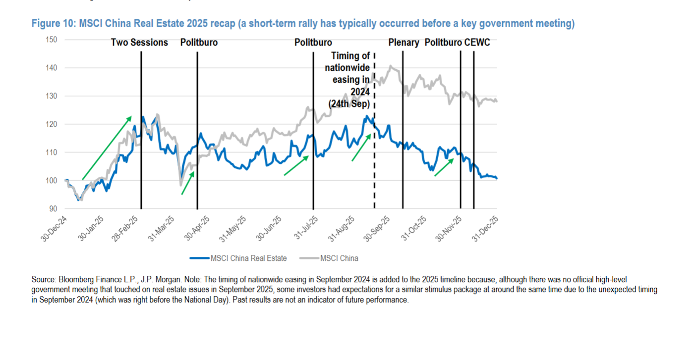 图10(2025年MSCI中国房地产指数表现)显示,2025年关键政府会议前板块均出现短期上涨,源于投资者“以防万一”的投机心态,这一规律或支撑板块在4月底政治局会议前保持强劲,但波动率较高。