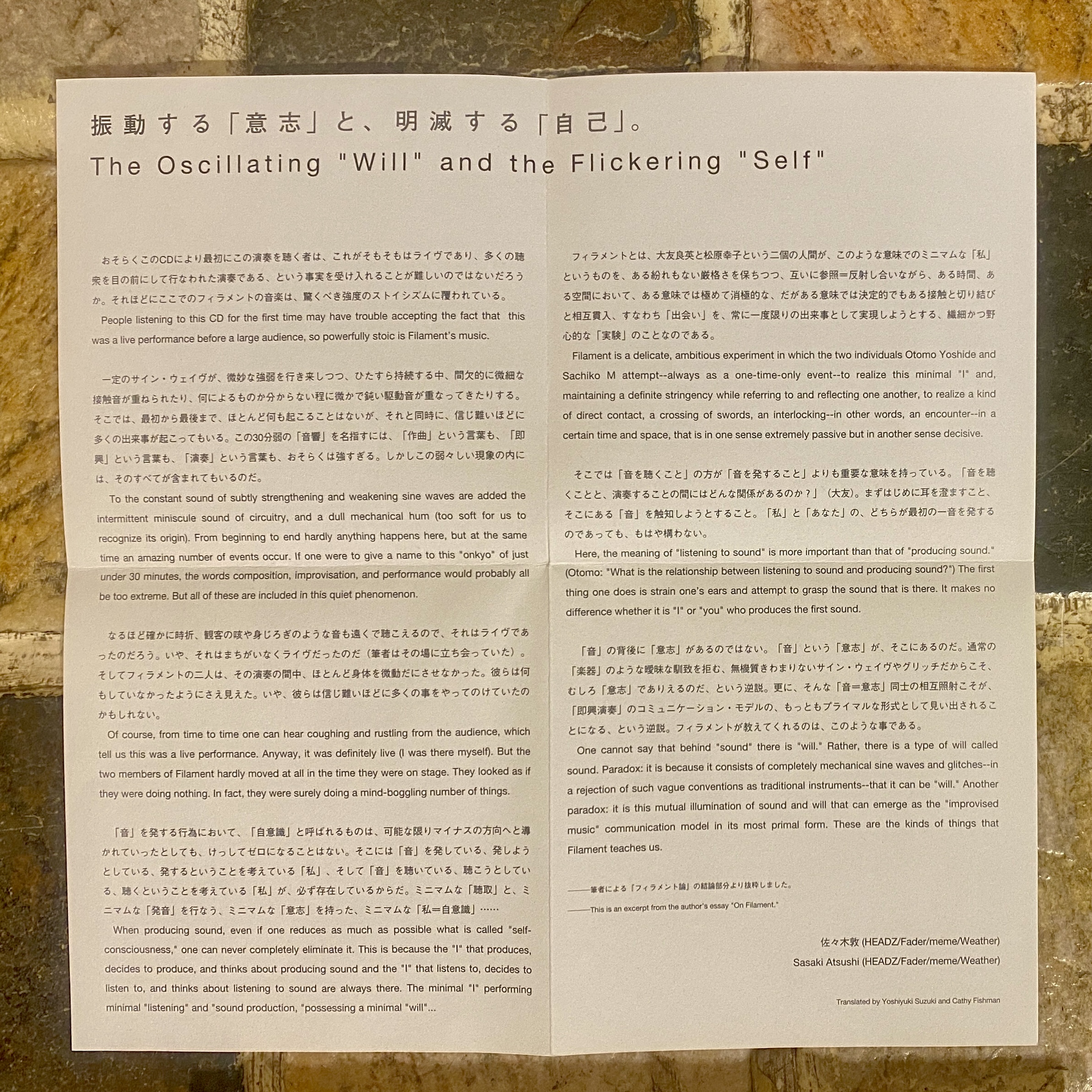 “并不存在‘在声音背后有一个意志’这样的事情。恰恰相反,是‘作为意志的声音’存在于那里。……正是这种相互照亮、相互显现的声音与意志之关系,才使得一种‘即兴音乐’的交流模型,以其最为原初、最为纯粹的形态浮现出来。”(佐佐木敦)