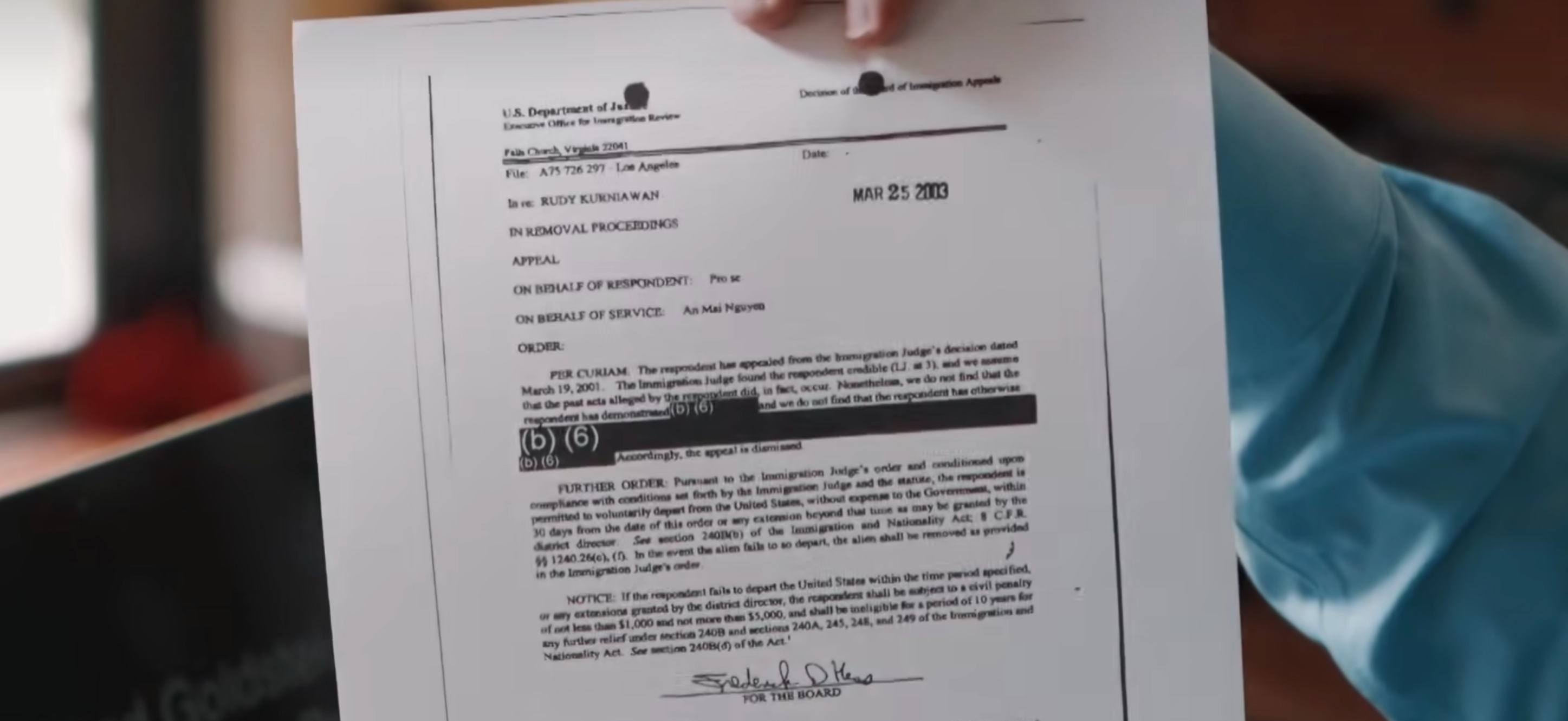Bill的团队经过资料收集收到了一份关于Rudy移民情况的信息,这是一份美国司法部在2003年针对Rudy的驱逐令,驱逐文件里要求他从接到通知开始30天内离开美国。