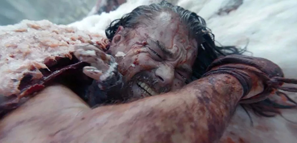 ▲ 《荒野猎人》中,小李子躲在马肚里