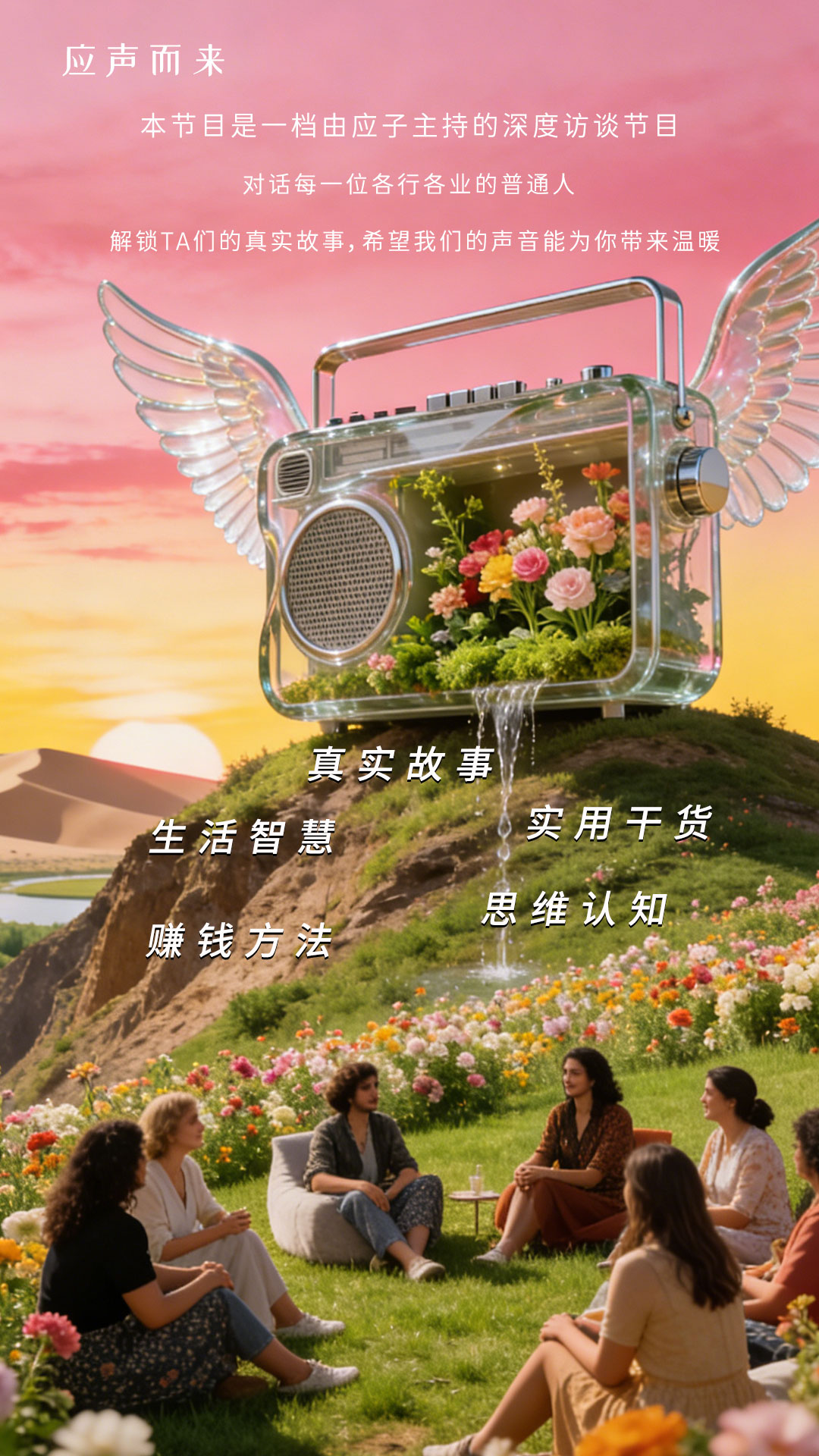 本节目是一档由应子主持的深度访谈节目,每集时间控制在10分钟至半小时左右,深度对话每一位各行各业的普通人,解锁他们的真实故事,沉淀鲜活的实用经验 —— 无论是日常的生活智慧、落地的赚钱方法,还是历经岁月沉淀的认知感悟,都可以在本档播客中听到。