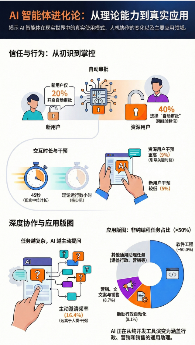这份报告通过 Anthropic 的最新研究,探讨了 AI 智能体在现实场景中的自主性,指出用户并非仅关注模型能力,更在乎人机协作的动态过程。研究发现,虽然技术上 AI 已能处理长达数小时的任务,但目前大多数用户的实际操作时间极短,且随着使用经验的增加,用户对 AI 的信任度与干预频率同步提升。通过分析 Claude Code 等工具的使用数据,文章揭示了 AI 智能体正从纯粹的编程辅助走向更广泛的通用任务领域,并强调了主动澄清与授权管理在建立“胜任自主性”中的核心作用。这标志着 AI 评估标准正从理想化的技术指标,转向研究人类如何通过持续的互动与纠偏来引导智能体完成复杂工作。