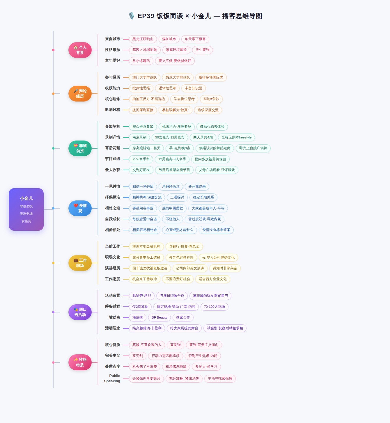 我们这一期的嘉宾小金儿是个精神需求很强, 追求灵魂上深度交流并勇于直面冲突的女生。 节目里的她频频举手、问题犀利、气场强大。 她打过辩论,做过脱口秀,还在高强度的金融行业工作,在繁忙中依然保持着对这个世界的好奇心。 在这期节目里她跟我们分享了她的爱情观以及参加《非诚勿扰》澳洲专场的经历。