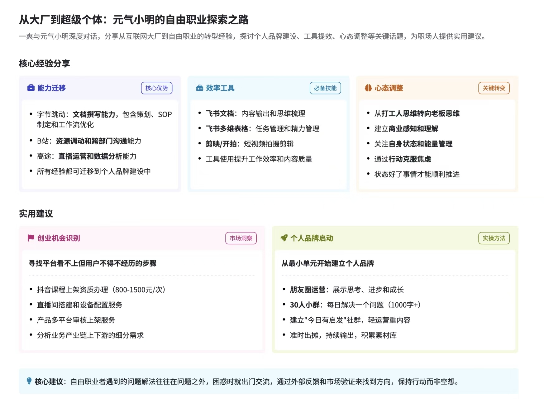在我的播客里,我与嘉宾们会聊到职场转型、提效工具、搞钱思路、亲密关系、时间精力管理、家庭等,涉及到超级个体的方方面面,目标是给自己构建一个稳定的支持系统,活出向往中「只工作不上班」的自在状态。