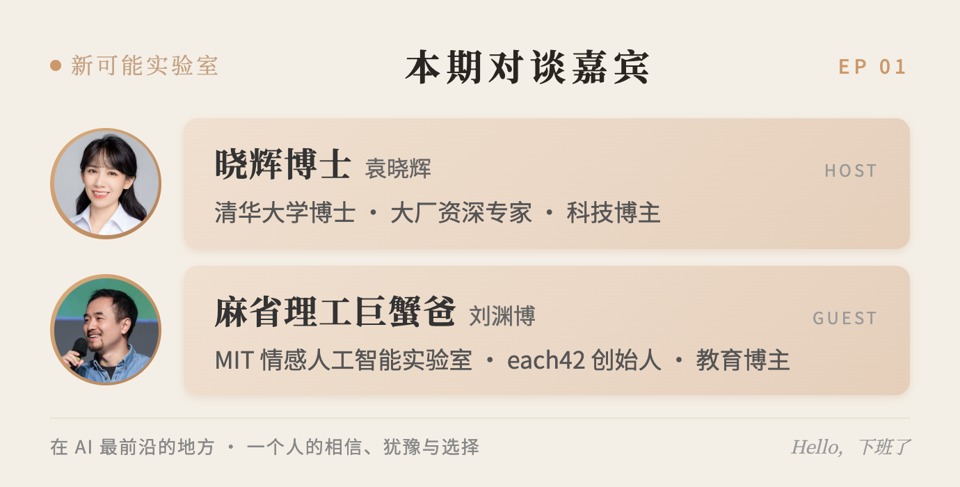 这是新可能实验室的第一期访谈。2026年2月19日,大年初三,我邀请到了刘渊博——麻省理工巨蟹爸,他是MIT情感人工智能实验室校友、AI教育领域的创业者,也是两个孩子的爸爸。我们一起聊了2个小时,讨论了AI时代的教育,讨论他为什么做出了让孩子脱离传统学校体系的选择。