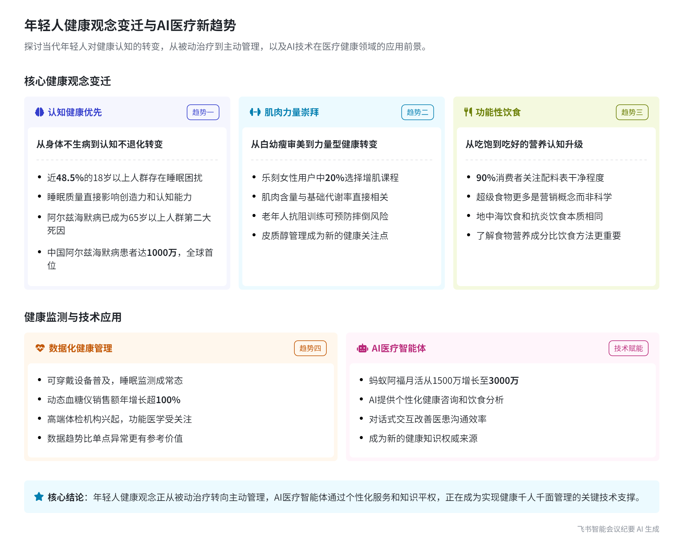 人们不再仅仅满足于“不生病”,而是积极探索如何优化睡眠质量、增强肌肉力量、精密调控饮食、用AI管理健康——这本质上是一种在现代性风险中,试图通过对身体的掌控来获得生命确定性的努力。而这场微观层面的个体实践,又恰与宏观层面技术在健康垂域的爆发(例如医学健康智能体)互为镜鉴。技术降低了个性化健康管理的门槛,而大众日益精细的需求又反向推动了技术的演进,共同勾勒出未来健康管理的图景。