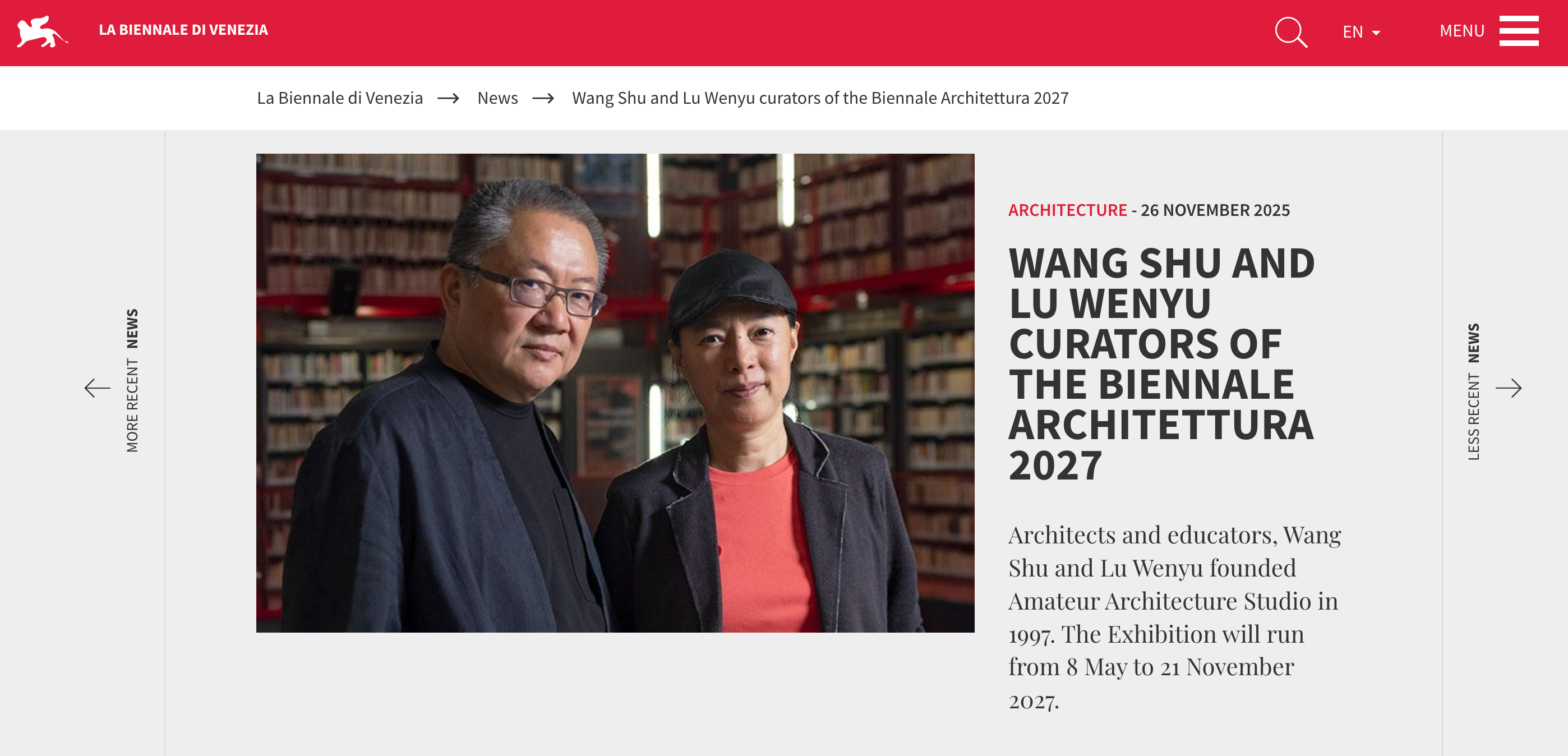 - 🔮 2027前瞻:王澍+陆文宇将执掌第20届建筑双年展,东方哲学能否为疲惫的西方建筑界带来新叙事?