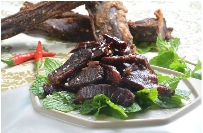 牛干巴:盐+花椒+酒腌制,太阳晒干(非阴干)