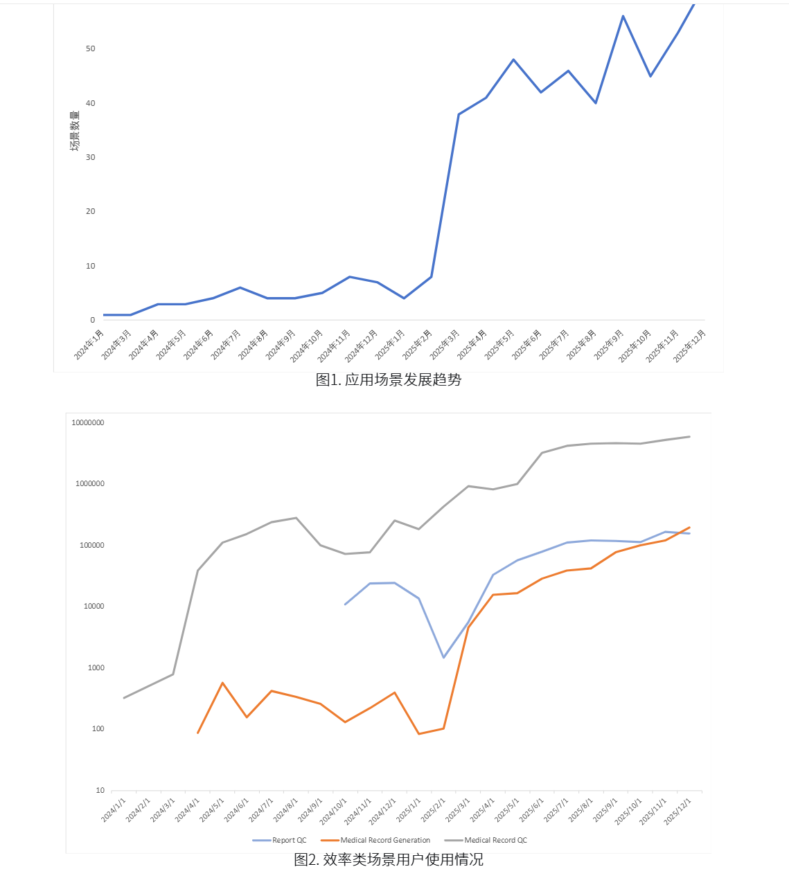 先看关键数据,图1(报告P8)是2024-2025年医疗AI应用场景发展趋势,能明显看到临床效率类场景从2024年底开始爆发式增长,到2025年下半年已突破60个,说明行业不再玩概念,而是真刀真枪解决临床痛点。图2(报告P8)更直接,Report QC(报告质控)和Medical Record QC(病历质控)的使用量在2025年9月迎来百万级暴涨,印证了医疗AI从“监管工具”转向“效率引擎”的转变。