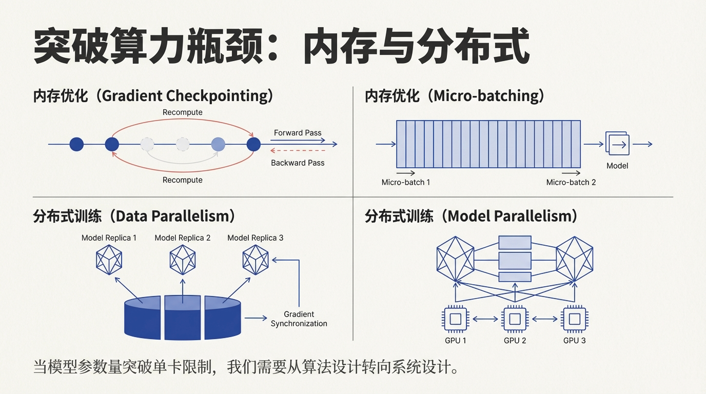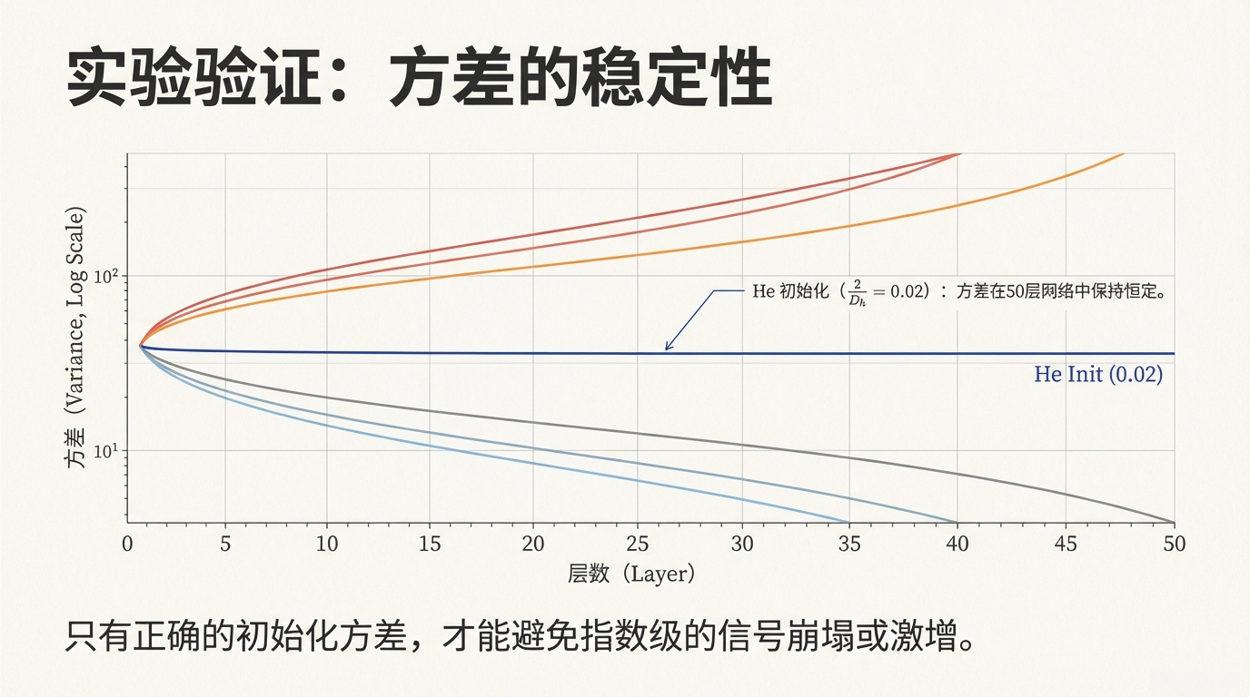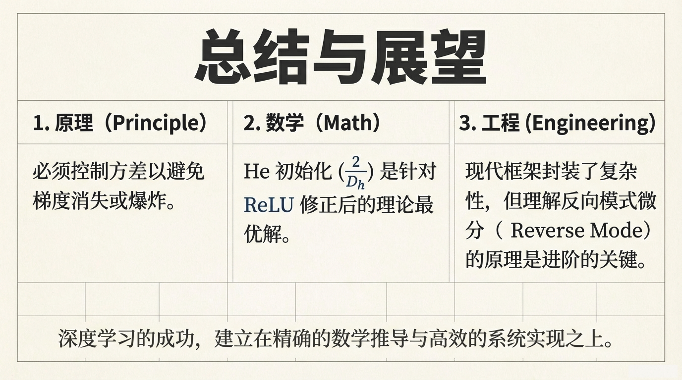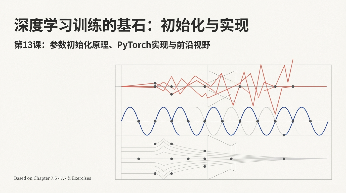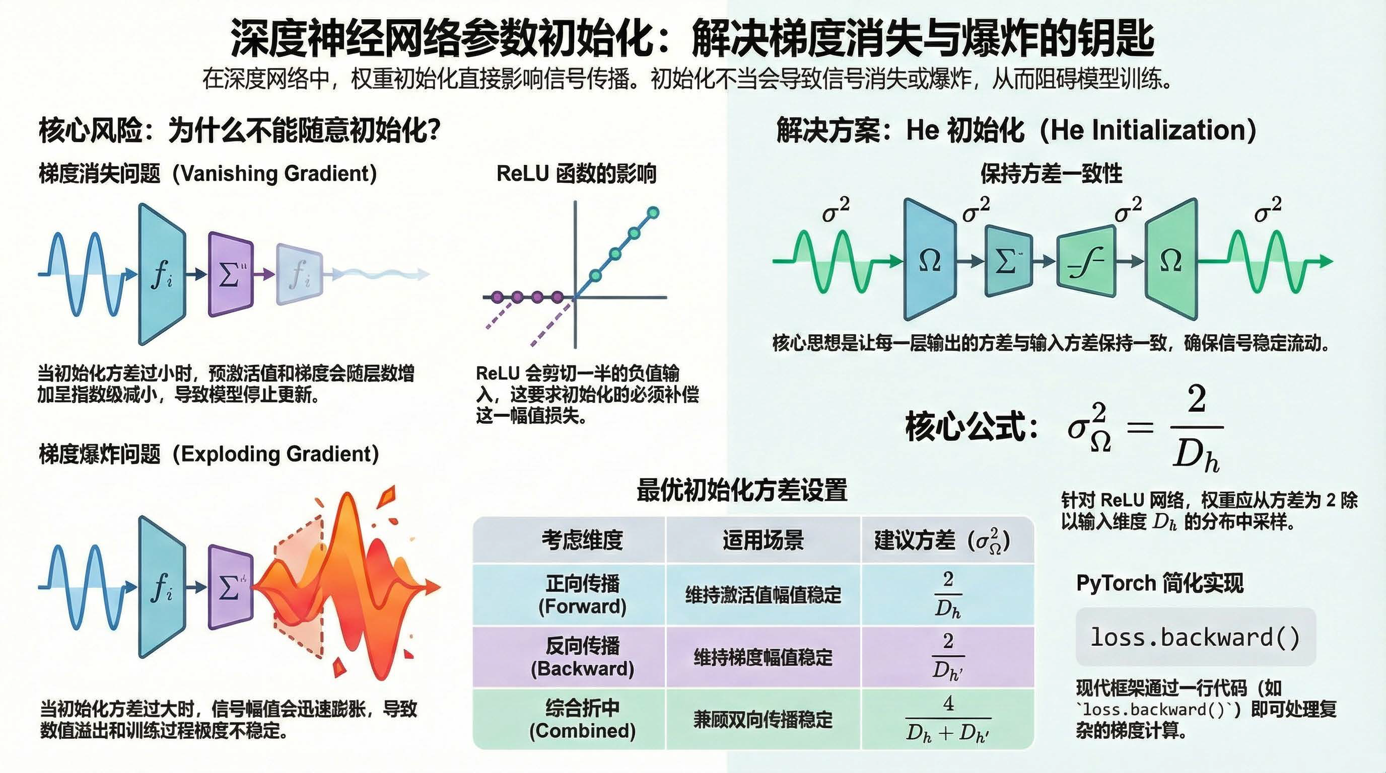 本课聚焦参数初始化与训练实践。重点推导了 **He 初始化**,旨在维持传播过程中激活值与梯度的方差稳定,从而有效解决梯度消失与爆炸问题。此外,还介绍了内存优化技术及支持超大模型训练的分布式并行方案。