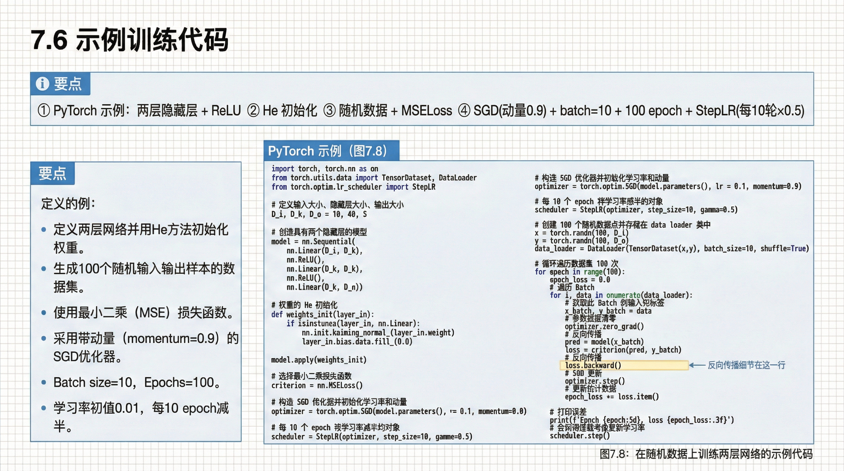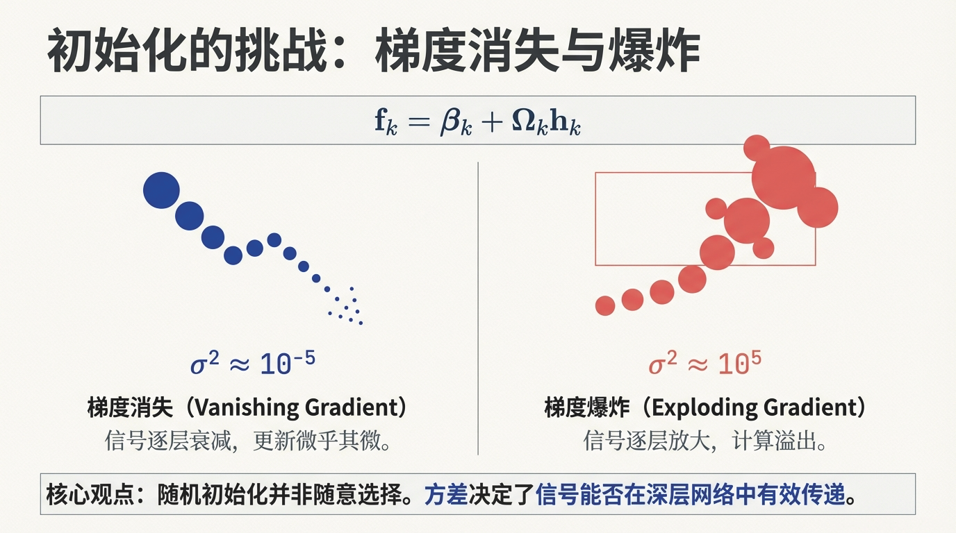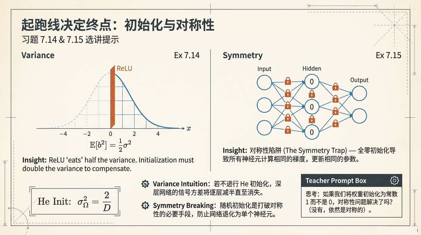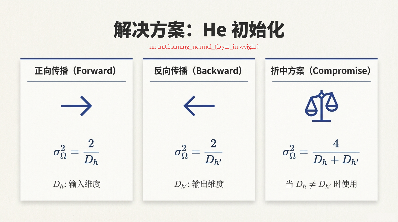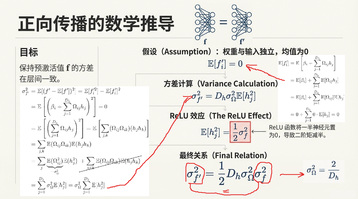 本课聚焦参数初始化与训练实践。重点推导了 **He 初始化**,旨在维持传播过程中激活值与梯度的方差稳定,从而有效解决梯度消失与爆炸问题。此外,还介绍了内存优化技术及支持超大模型训练的分布式并行方案。