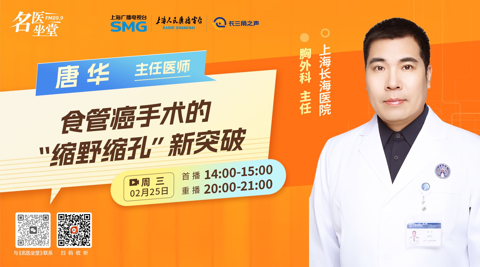 本节目为食管癌科普访谈,上海长海医院胸外科唐华主任介绍了食管癌的发病、病因、症状、检查、治疗知识,解答听众提问,分享了“缩野缩孔”微创手术与吻合口漏处理新方法。