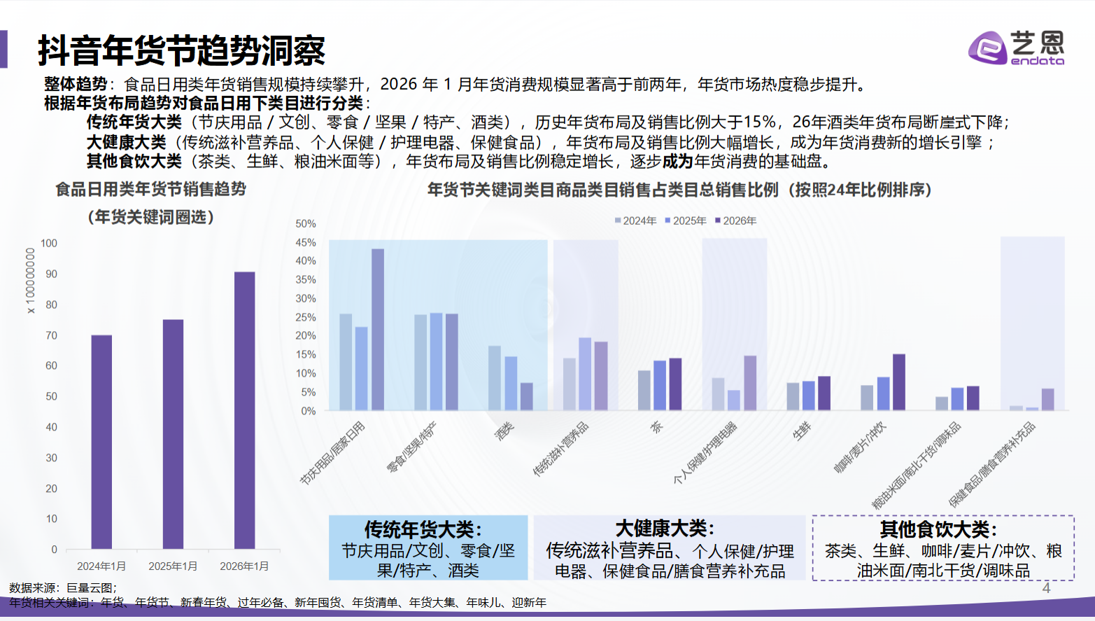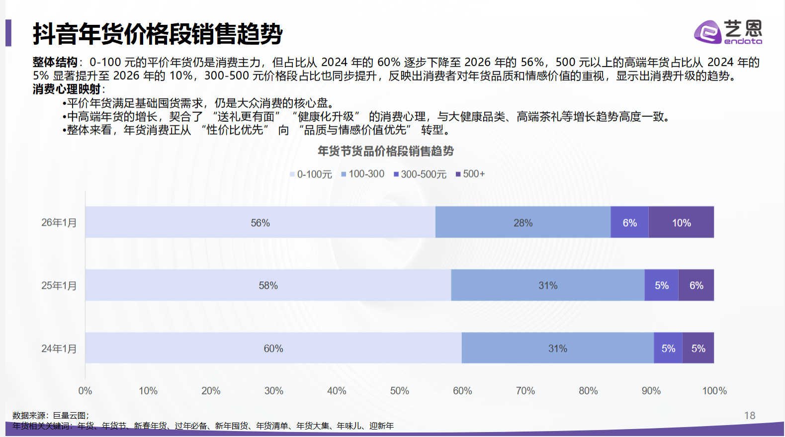 图4(研报第17页):年货节货品价格段销售趋势,2024-2026年价格结构变化一目了然,0-100元平价年货占比从60%降至56%,500元以上高端年货占比从5%翻倍至10%,300-500元中高端段占比也同步提升,直接印证年货消费的升级趋势,中高端年货的增长与大健康、高端茶礼的爆发高度契合。