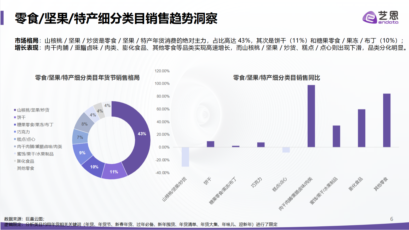 图2(研报第6页):零食/坚果/特产细分类目年货节销售格局,该饼图清晰展示品类占比,山核桃/坚果/炒货以43%的占比仍是绝对主力,饼干、糖果零食分别占11%、10%,但另一张同页的销售同比图显示,这个主力品类正下滑,而肉干肉脯、膨化食品等品类则高速增长,品类分化已成定局。