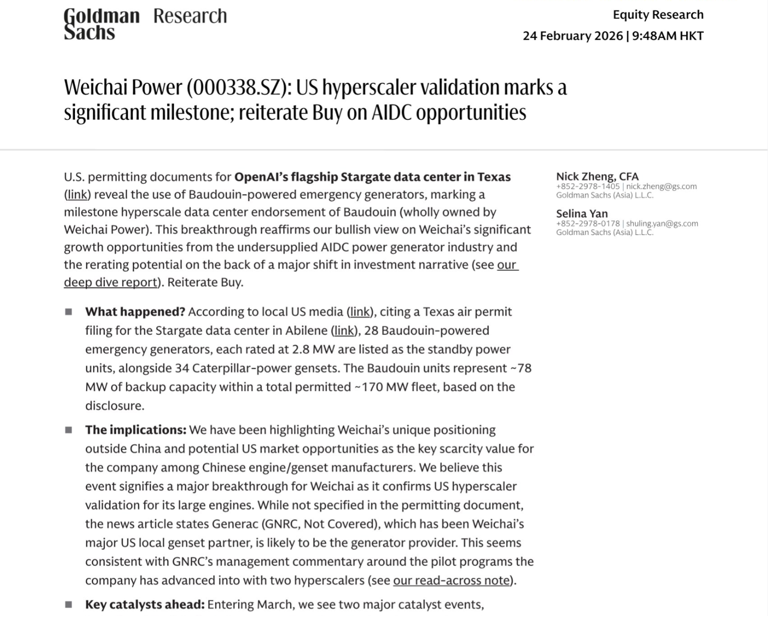 2026年2月24日高盛发布的潍柴动力([000338.SZ/2338.HK](000338.SZ/2338.HK))最新研报,直接给出A/H股双买入评级,核心逻辑在于潍柴旗下博杜安拿下OpenAI美国核心数据中心订单,实现美国超大规模客户的关键验证,其投资叙事从重卡彻底转向AIDC发电,估值重估窗口已全面打开。