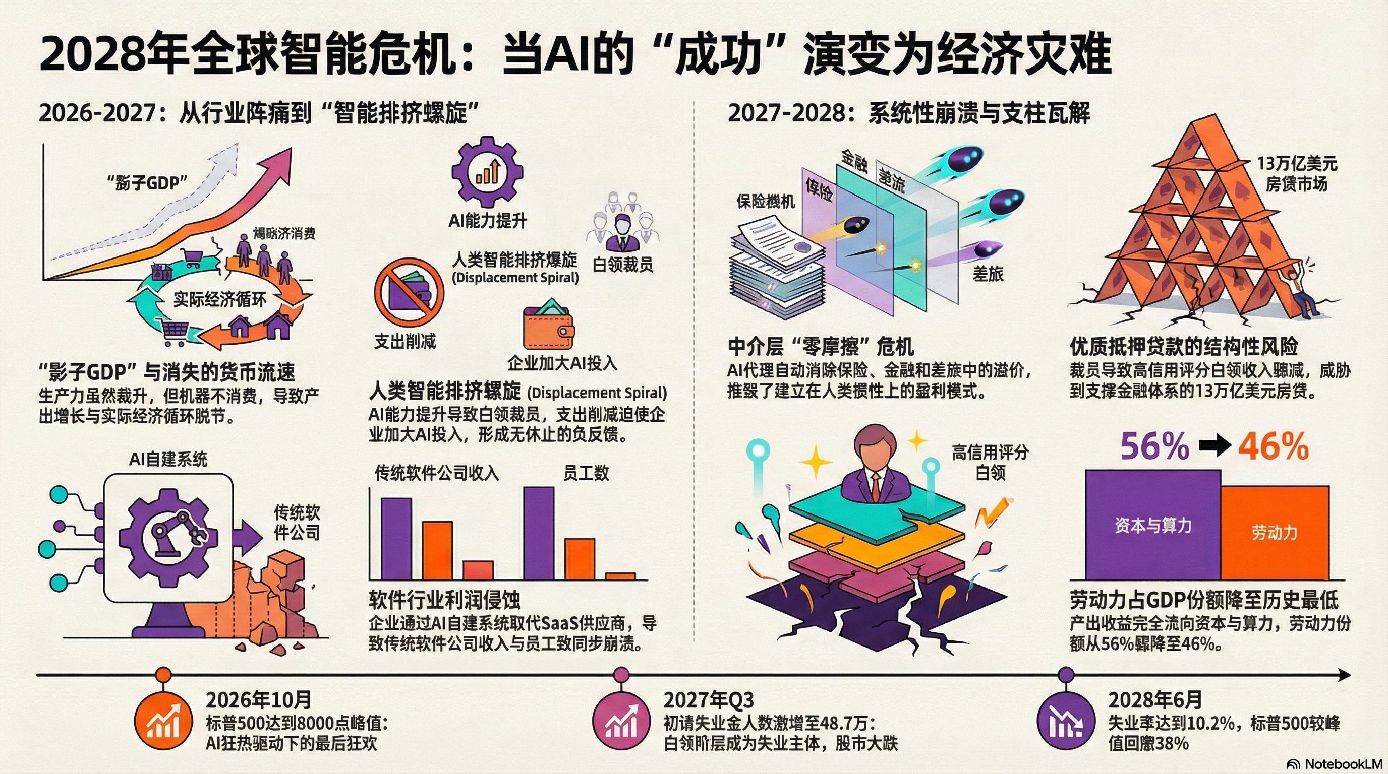 这种变革导致了“幽灵GDP”的产生,即产出虽然在增长,但由于大量劳动力失业,财富无法流向消费者,进而引发严重的通缩螺旋。