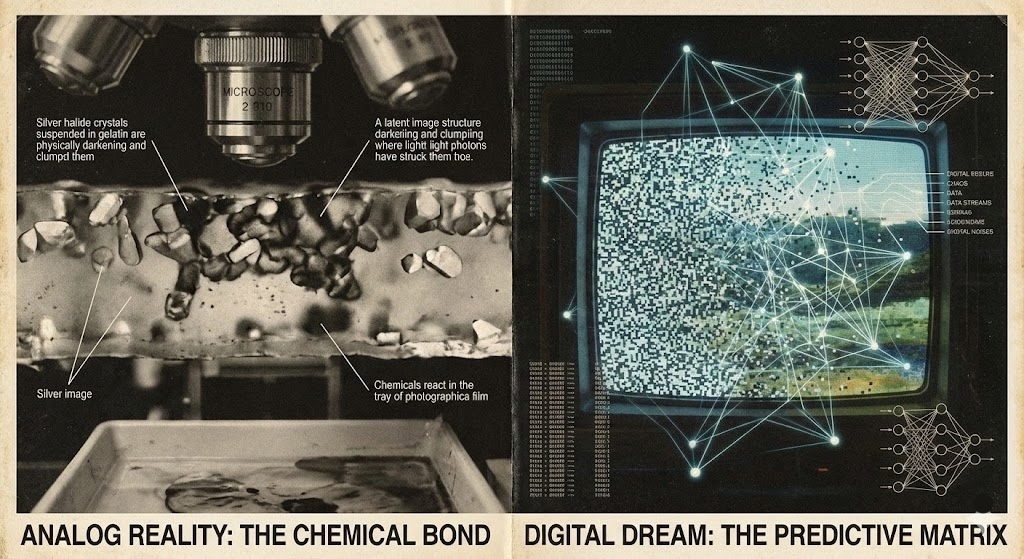 光之捕捉与光之生成 | 对比图:一边是光线穿过老式相机镜头与银盐发生化学反应;另一边是从一团雪花般的噪声中,AI 凭空预测和“生长”出不存在的画面。