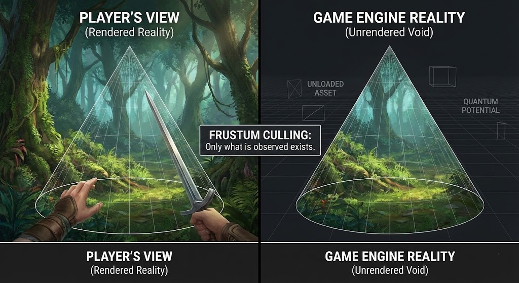 视界渲染 (Frustum Culling) 示意图 | 游戏术语科普:展示在大型游戏中,只有玩家视野内的景物才会被加载,视野外则是一片虚无。这被用来比喻量子力学中的“观察者效应”。
