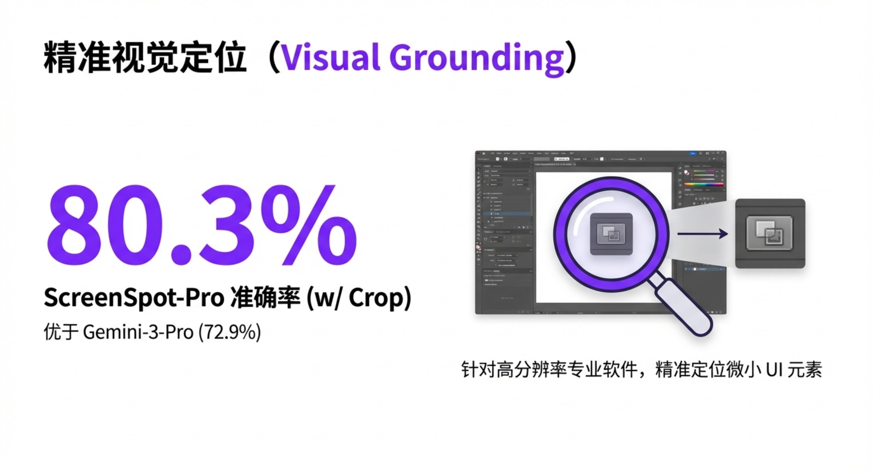 ScreenSpotPro(UI元素定位):获得80.3分,精准识别界面元素。