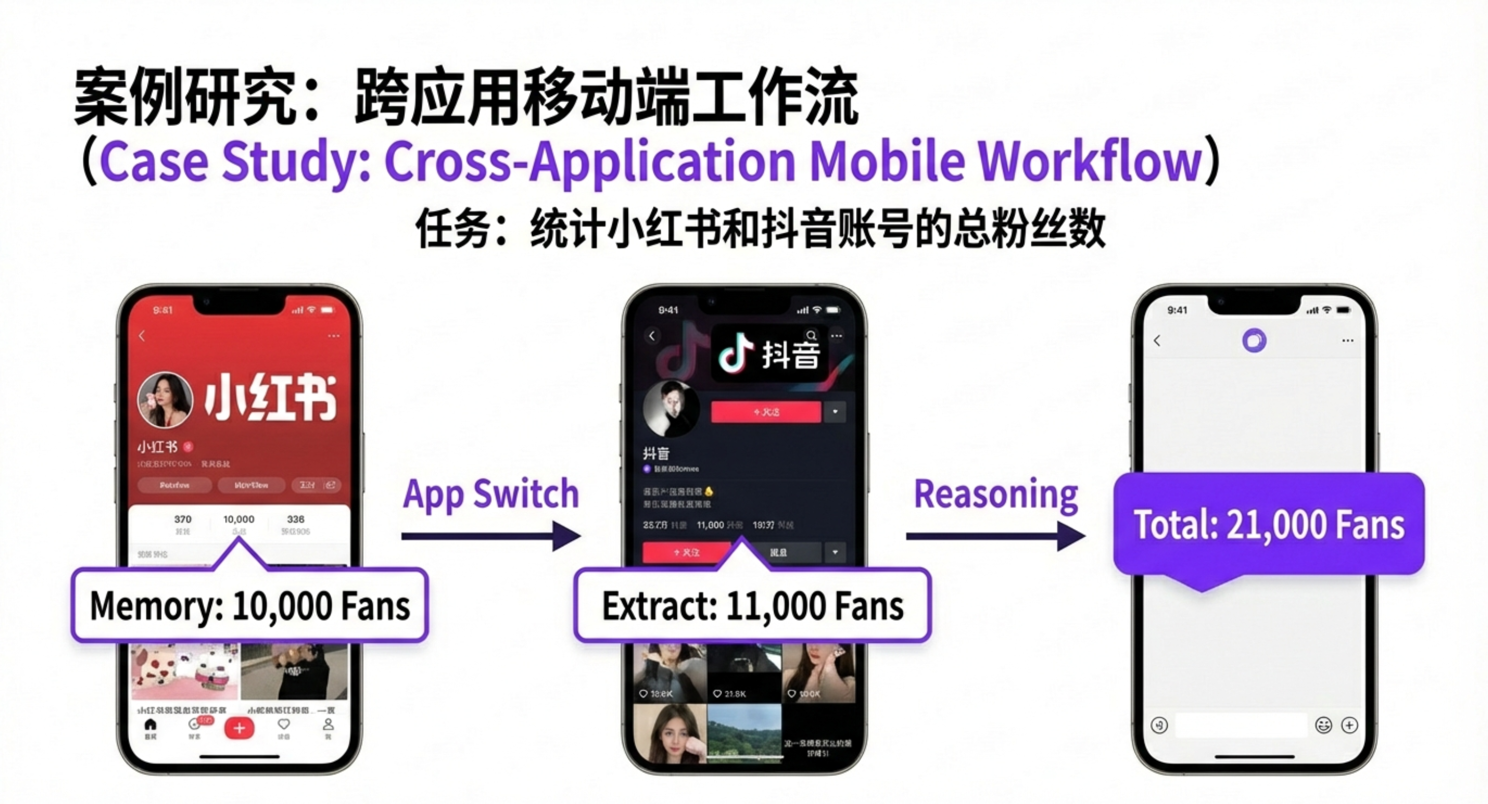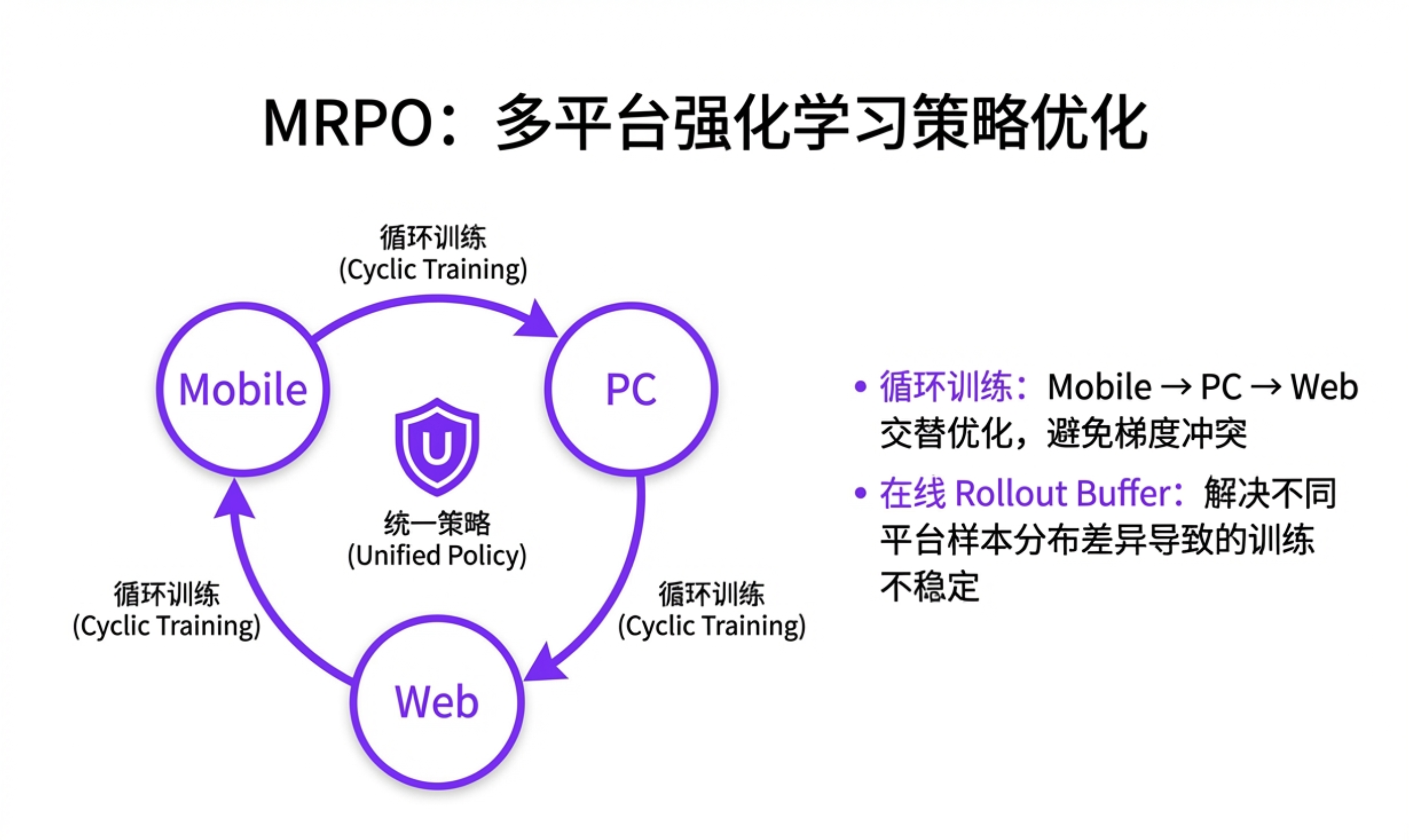 多智能体协作:支持模型在结构化系统中扮演不同角色——有的负责规划,有的负责执行,有的负责校验,如同一个配合默契的团队。 - 多平台强化学习缩放(MRPO):这是解决跨平台训练冲突的关键算法。不同平台的交互逻辑差异巨大,MRPO通过交替优化和稳定采样,有效减少了梯度干扰,让模型能同时吸收来自各平台的经验,而非相互抵消。