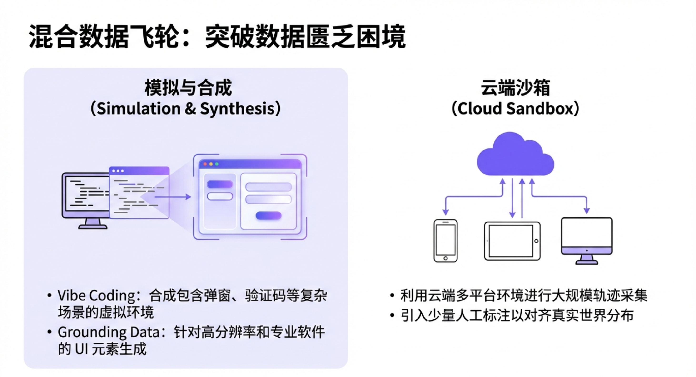 - 混合数据飞轮:这是提升数据效率与质量的核心。团队通过结合模拟环境和云端沙盒环境,构建了高效的数据流水线。这包括针对复杂应用GUI的硬定位数据合成,以及基于真实用户轨迹的数据扩展,让模型见多识广。