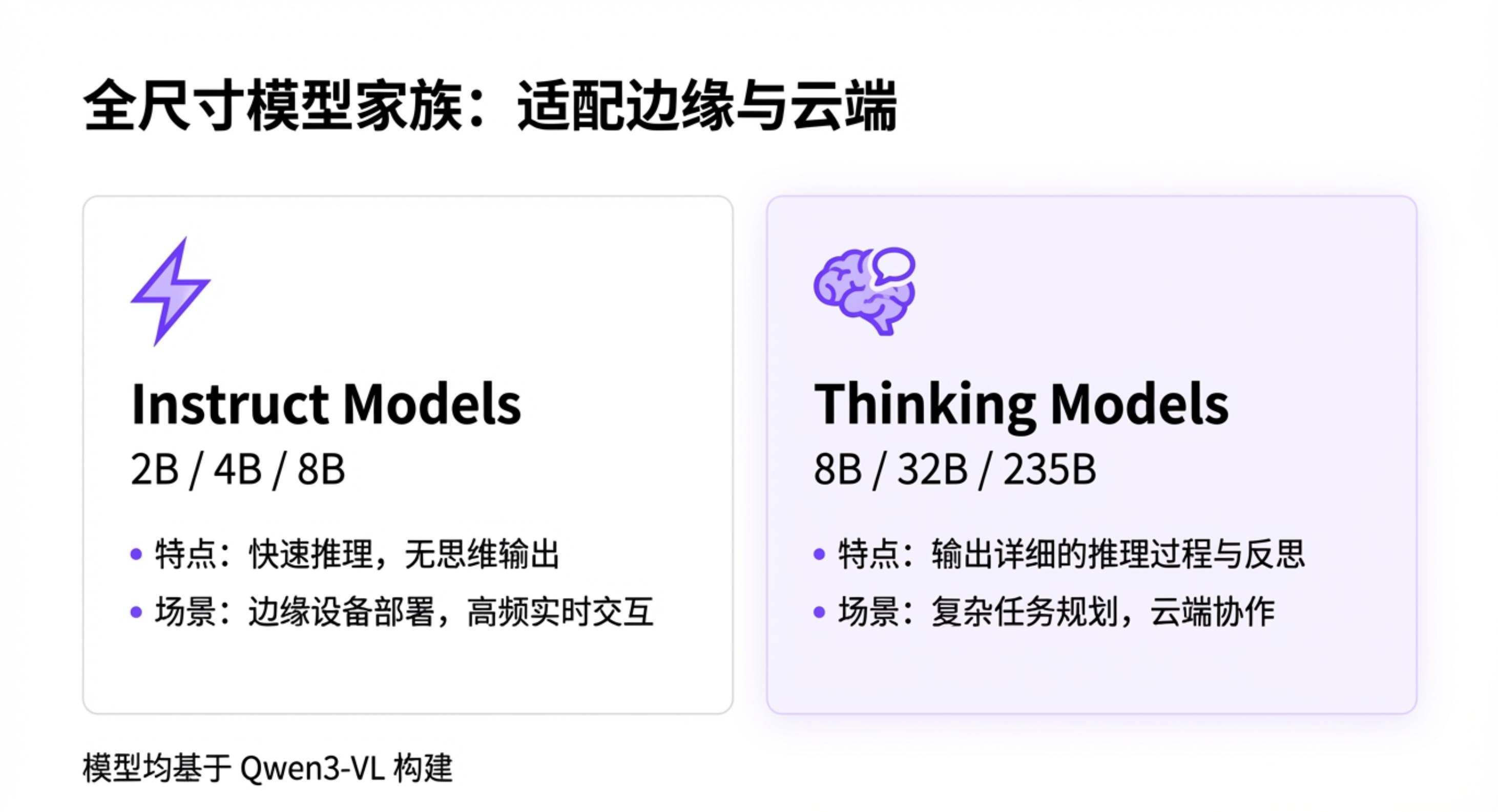 - 丰富的版本矩阵:模型涵盖从2B到235B的多种参数规模,并提供 Instruct(指令版)和 Thinking(思考版)两种变体。小巧的指令版适合边缘部署,实现高频实时交互;强大的思考版则擅长复杂任务的规划与反思,适合云端调用。