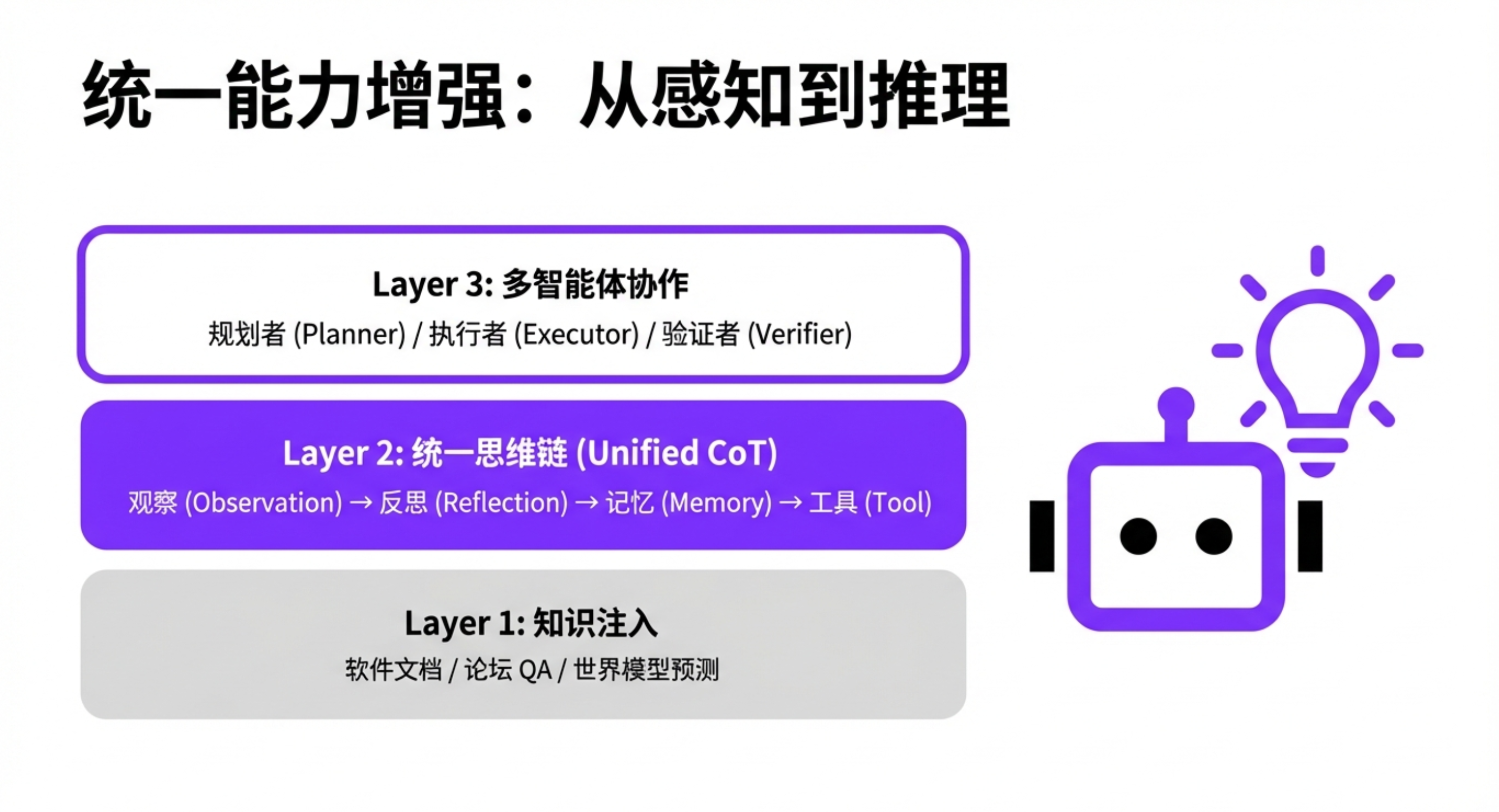 统一思维链合成:为每一条轨迹数据增加分步观察、反思、内存管理和工具调用推理的“内心独白”。这让模型在长程任务中,不仅知道“做什么”,还懂得“为什么做”和“下一步想什么”。