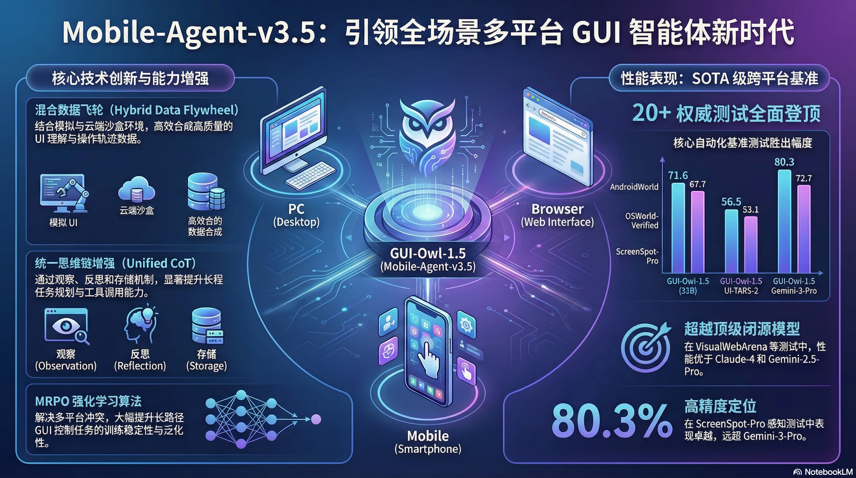 GUI-Owl 1.5 的出现,标志着开源 GUI 智能体在能力上已迈入可与顶尖闭源模型同台竞技的新阶段。它通过精妙的数据合成、统一的思维增强和创新的多平台训练算法,证明了“全能型”智能体的可行性。对于开发者而言,这不仅是技术论文中的数字,更是一套可以直接下载、部署、定制的工作流自动化工具箱。未来,当越来越多的 AI 能替你“点击”和“操作”时,我们与数字世界的交互方式,将迎来真正的范式转移。