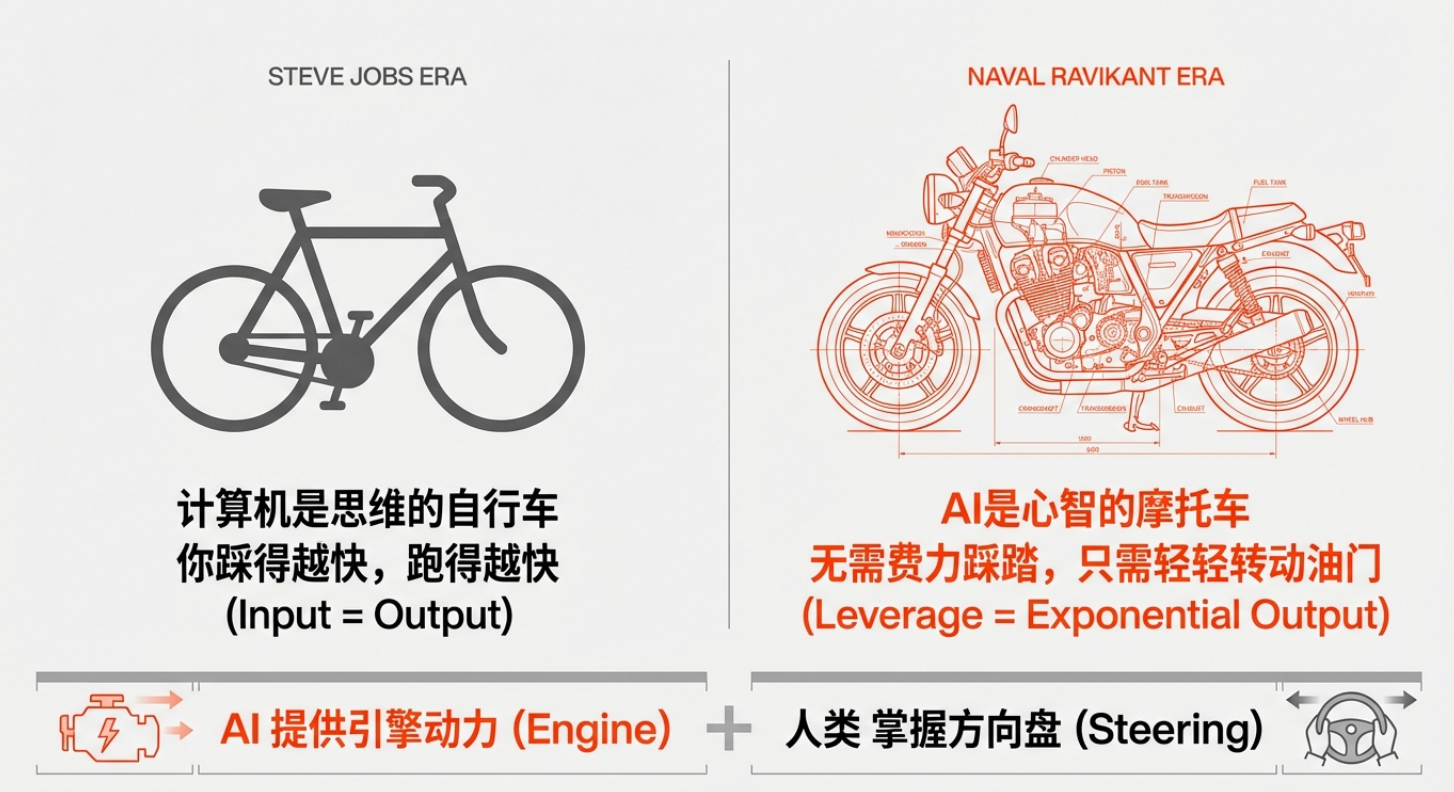 当 AI 焦虑席卷职场,硅谷传奇投资人纳瓦尔在最新播客《A Motorcycle for the Mind》中,给出了关于人机共生时代的底层答案。在他眼中,AI 不是取代人类的对手,而是让强者更强的 “思想摩托车”—— 拥有强悍引擎,却永远需要人类掌控方向。这 52 分钟的深度分享,拆解出 AI 时代的生存法则,读懂以下核心观点,就能跳出焦虑,找准自己的不可替代之路。