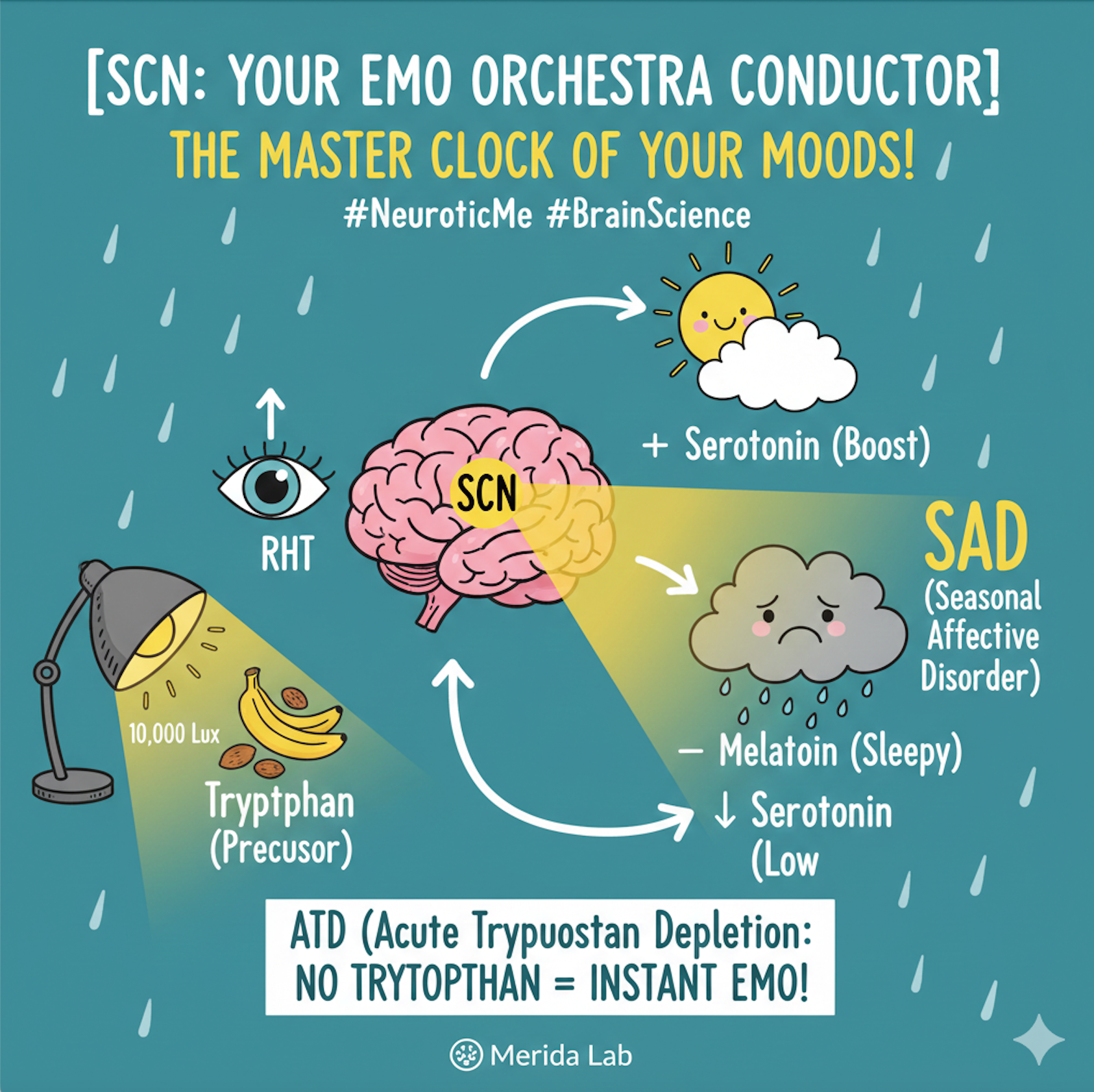 本期我们拆解一份雨天emo报告:为什么一下雨,我们就突然失去雄心壮志?为什么阴天更想躺平、更想吃碳水、更容易多想?这一期,我们走进大脑版《疯狂动物城》,认识那位只负责“时间”的幕后操盘手——大先生SCN,以及维持情绪地基的血清素工程队。